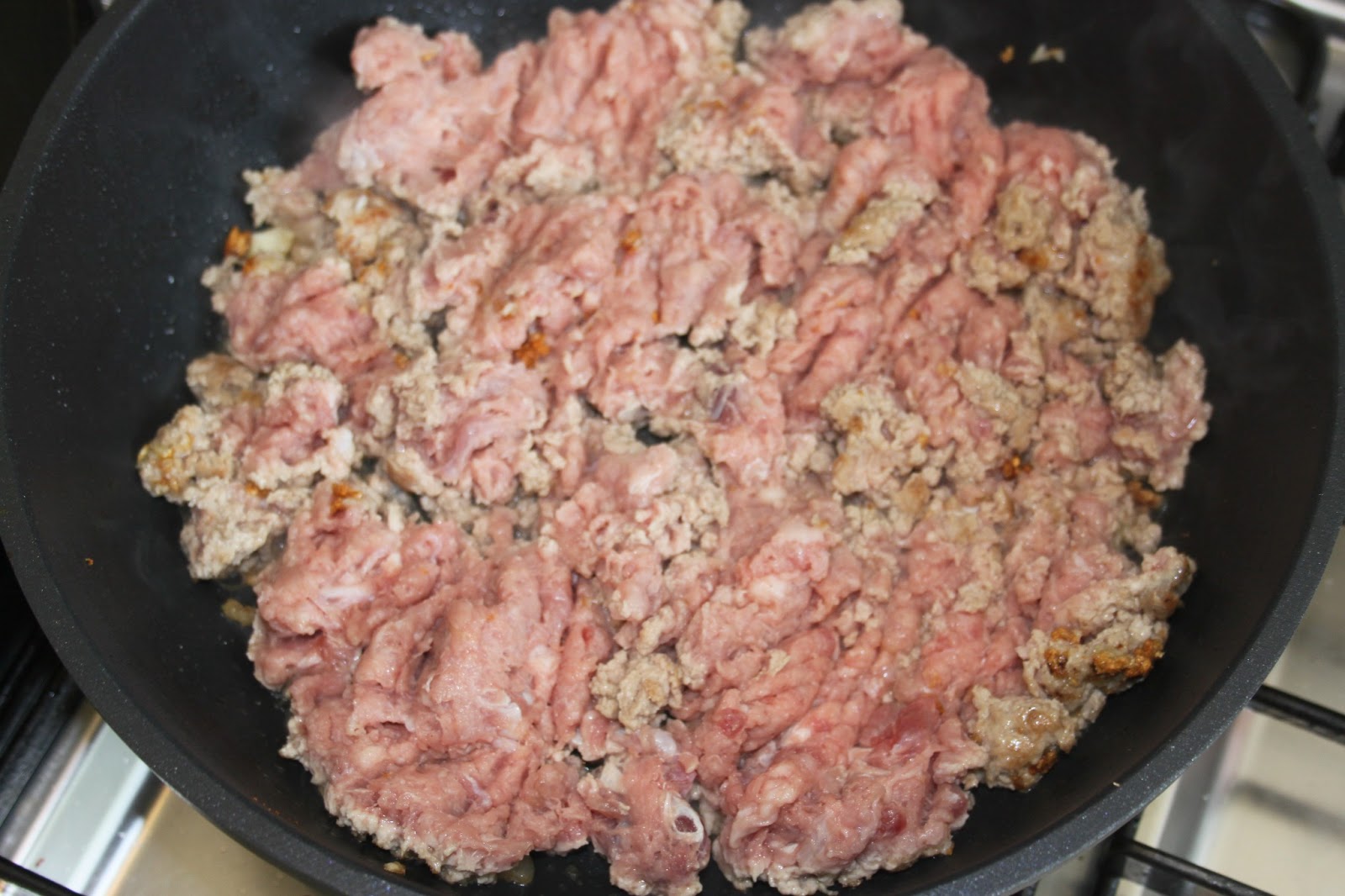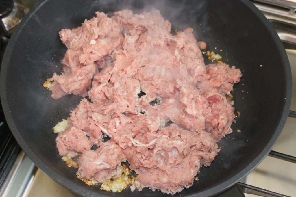 - Laisser griller un petit peu l’ail puis ajouter la viande hachée (mixée dans mon cas).