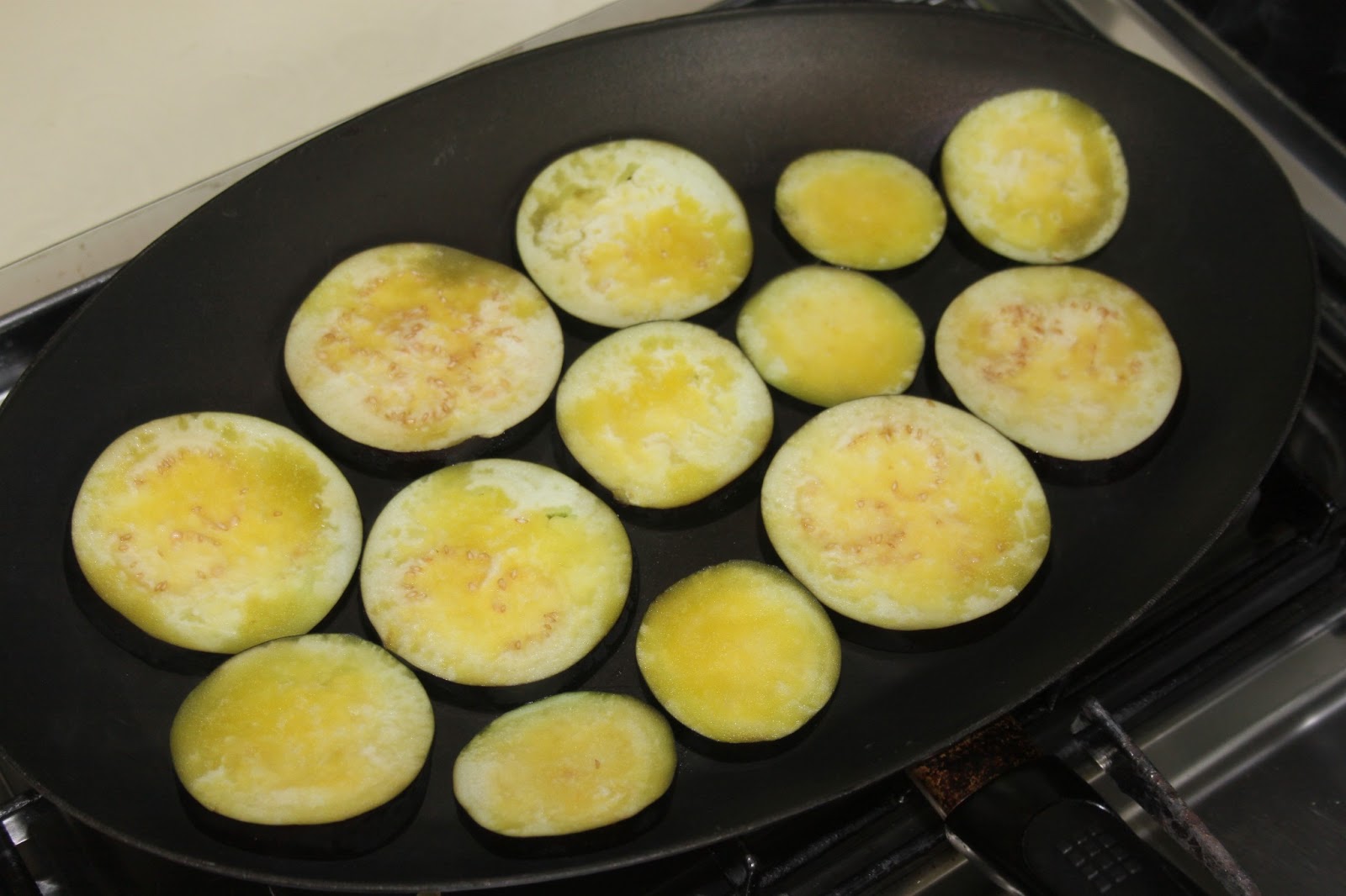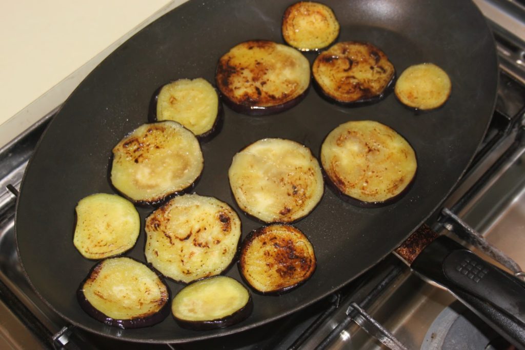 - Les faire giller des deux côtés. Quand les aubergines sont bien grillées des deux côtés, les mettre à refroidir sur du papier absorbant puis bien les saler.Faire de même avec toutes les tranches (c’est l’étape la plus longue..).