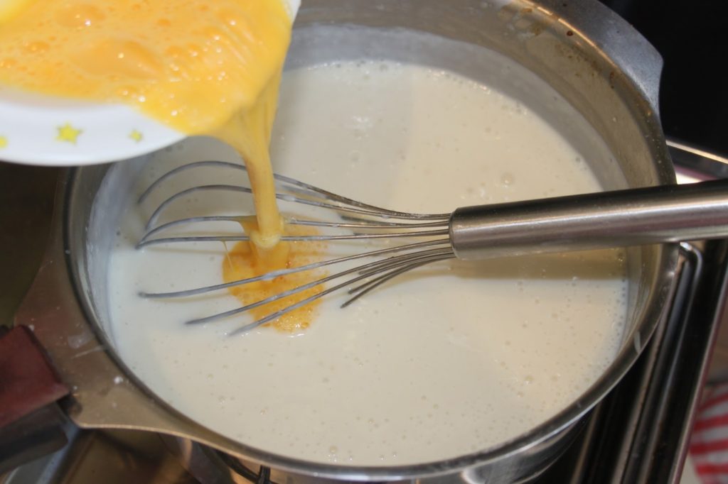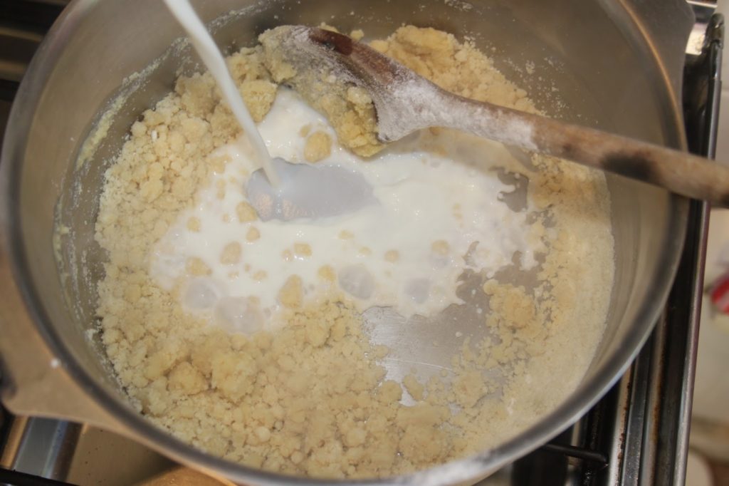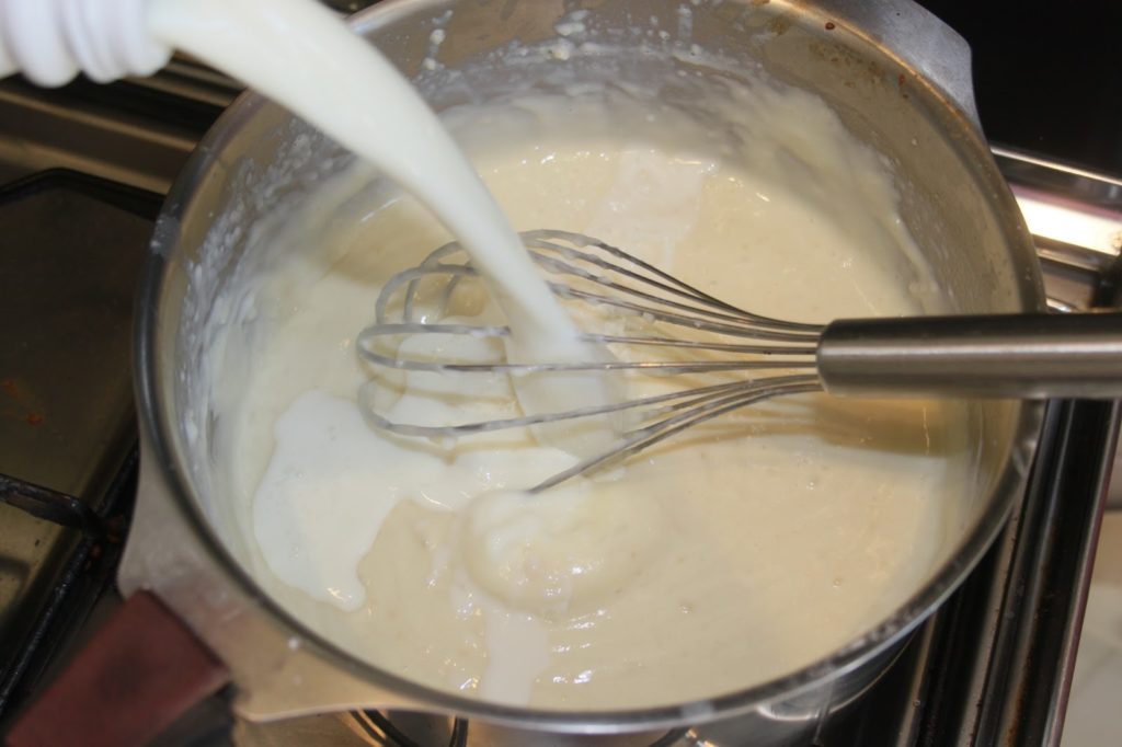 - Ajouter très progressivement le lait en mélangeant vivement à chaque fois pour éviter les grumeaux. C’est un peu difficile au départ mais ça fait des muscles !