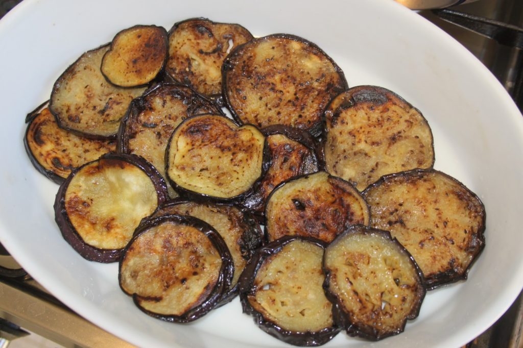 - Mettre une couche de tranches d’aubergines grillées dans une grand plat à gratin.