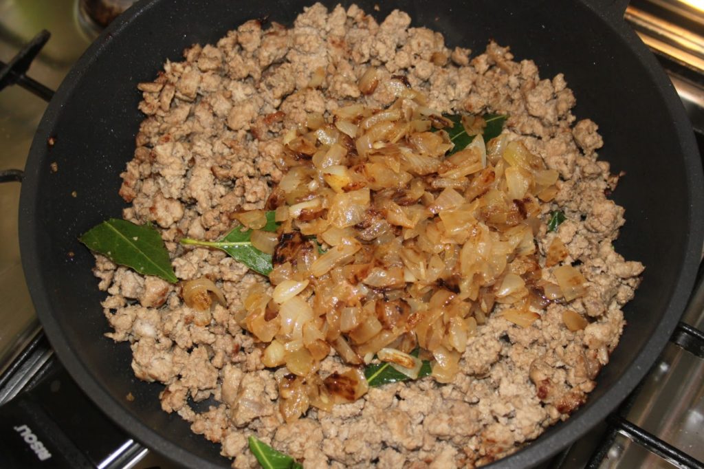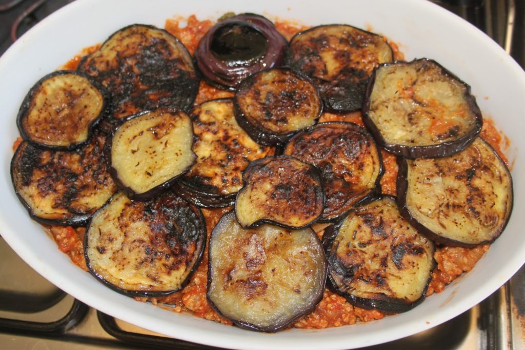 - Ajouter une bonne couche de viande (dont on aura ôté les feuilles de laurier) puis recouvrir avec des aubergines.