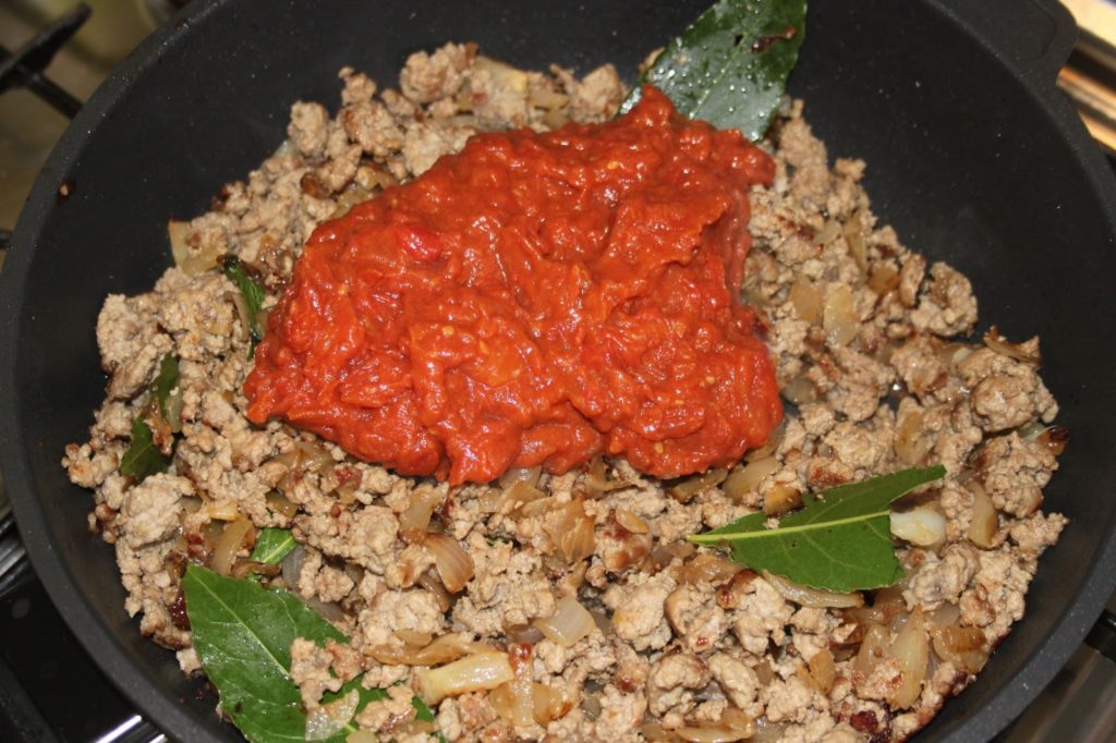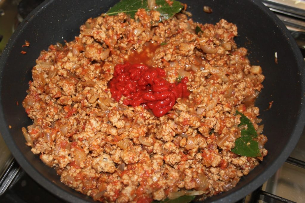 - Puis le double concentré de tomates avec un peu d’eau pour avoir une viande légèrement humide (très peu!).