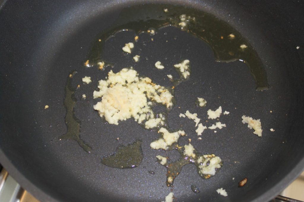 - Enfin la viande: mettre deux cuillerées à soupe d’huile d’olive avec les gousses d’ail écrasées dans une poêle sur feu assez fort.