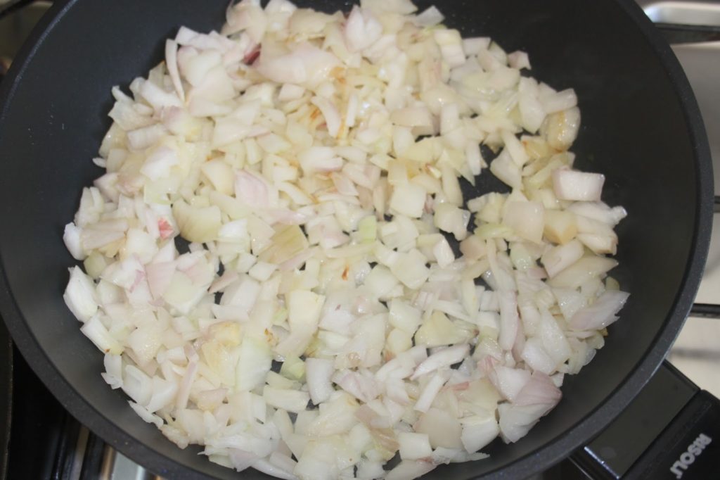 - Pour les oignons: les couper en petits morceaux avec deux cuillerées à soupe d’huile d’olive.
