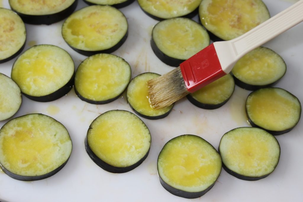 - Couper les aubergines en tranches de 1 cm puis badigeonner les tranches d’huile d’olive sur les deux faces.