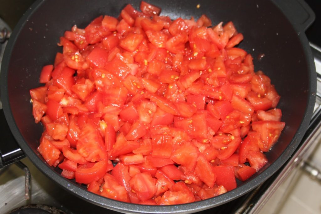 - Se débarrasser avec une petite cuiller de la l’intérieur des tomates (graines et jus) puis les couper en petits morceaux.