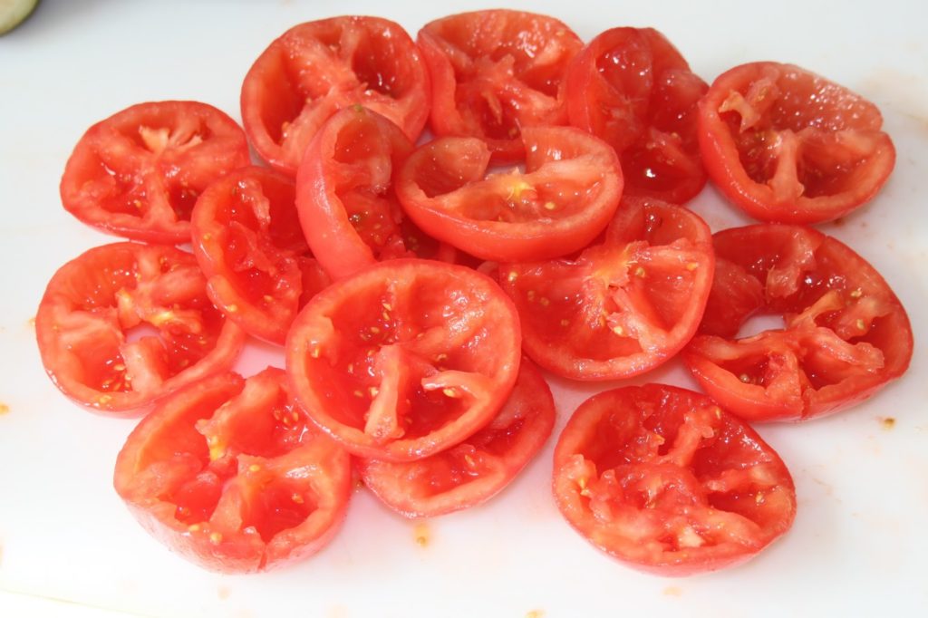 - Éplucher les tomates et les couper en deux dans la tranche.
