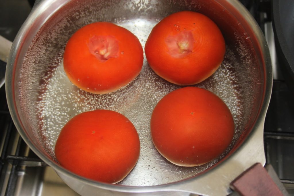 - Les ébouillanter pendant trente secondes puis les passer sous l’eau froide pour pouvoir les éplucher facilement. La peau partira toute seule.