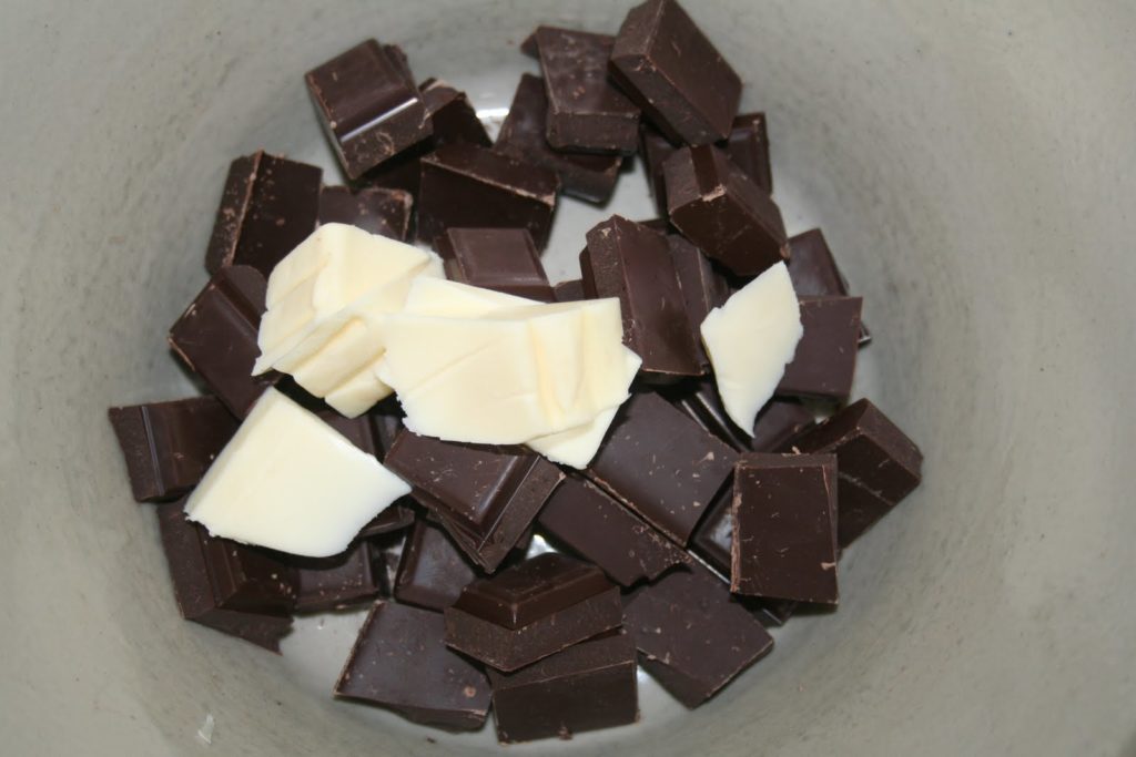 - Fondre au micro-onde ou au bain-marie le chocolat et le beurre (salé ou de cacao). Le fait d’ajouter un peu de beurre va permettre au chocolat de ne pas durcir tout de suite avec l’ajout de jaune d’oeuf. Et dans le cas du beurre de cacao, de figer un peu plus la mousse.