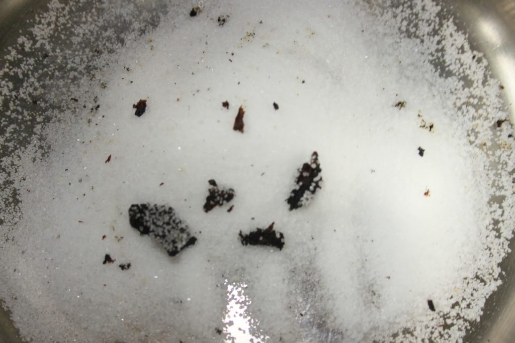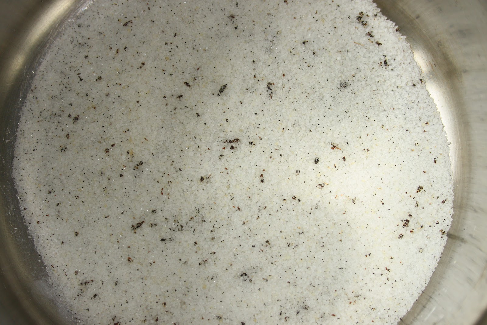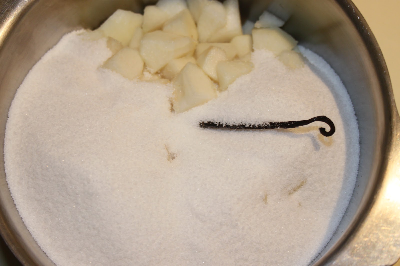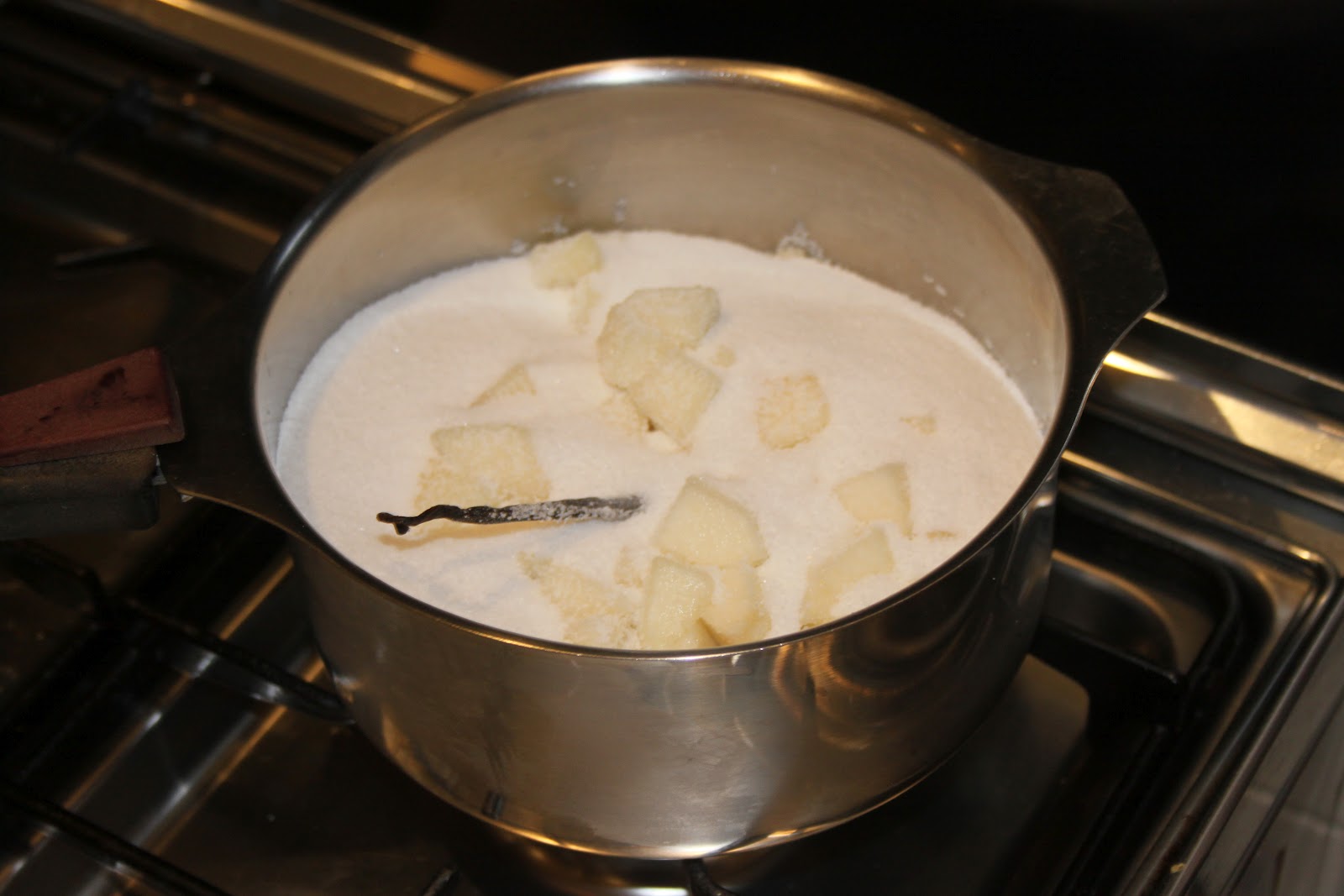 - mettre le sucre et l’intérieur de la gousse de vanille dans une casserole. Note de Bernard: Si on utilise l’agar agar (je n’aime pas ça, c’est trop précis, il faudrait une balance au milligramme près!), il faut ajouter les deux gammes dans le sucre et bien mélanger et surtout ne pas ajouter la gélatine à la fin!