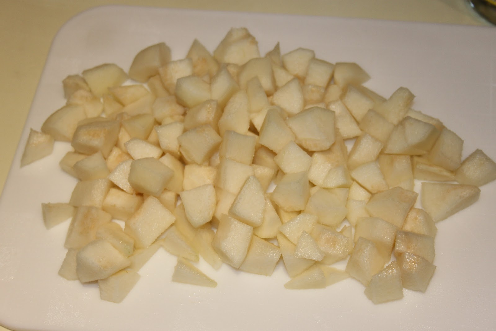 - Éplucher et couper les poires en morceaux, il faut au moins 250g de fruit en tout.