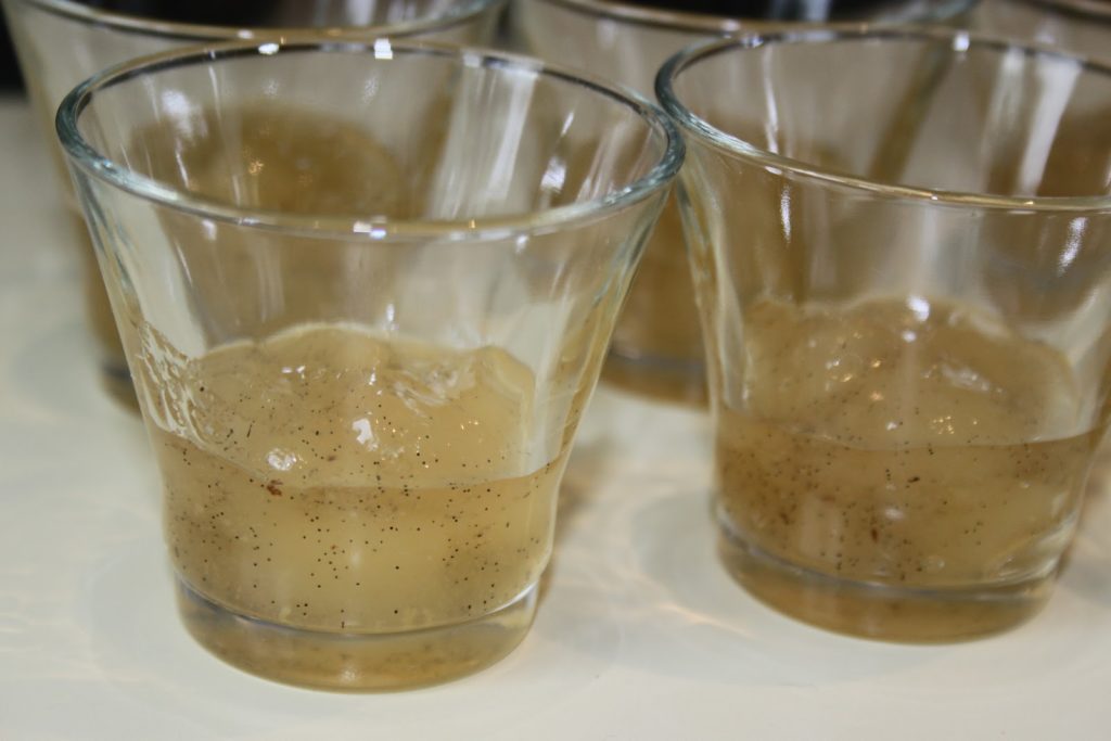 Verser au fond des petits verres, ou de petits bols, la compotée de poires à la vanille.