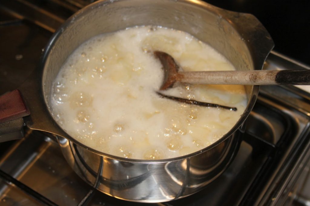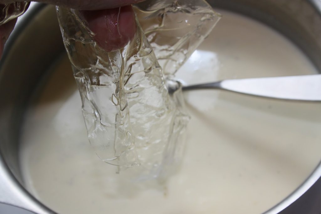 - Quand la crème frémit (cela ne sert à rien qu’elle bout!), ajouter une à une les feuilles de gélatine essorée. Bien mélanger à chaque fois.