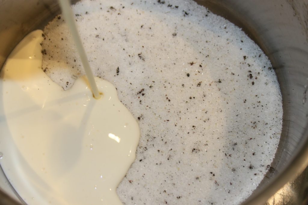 mettre le sucre et l’intérieur de la gousse de vanille dans une casserole.