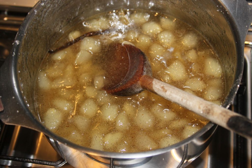 Il faut mélanger régulièrement. Sur les paquets de sucre à confiture, ils disent de cuire 5 minutes après ébullition. Je trouve que c’est beaucoup trop juste et la poire ne sera pas du tout cuite! Il faut laisser au moins trente à quarante minutes pour cette recette: la poire doit devenir translucide!