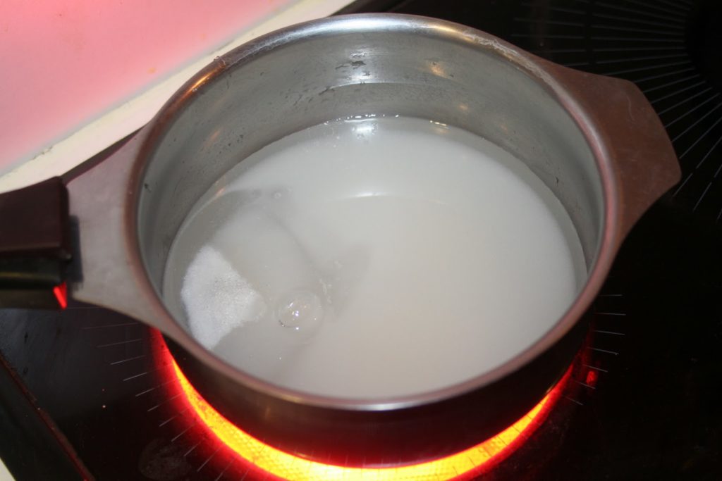 - Mettre le sucre, le sirop de glucose et l’eau dans une casserole sur feu modéré.