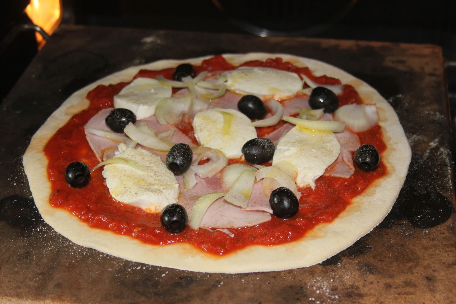 - Puis mettez les ingrédients à votre convenance ! Ici: jambon, mozzarella, olives noires, oignons…