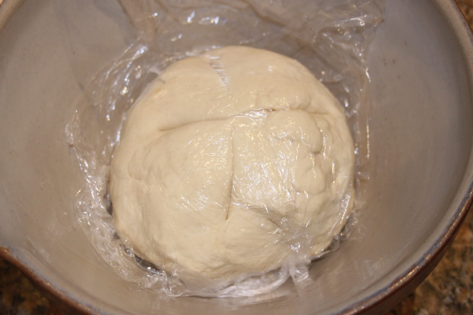 Mettez la boule de pâte dans un grand bol (je l’ai enlevée du bol pétrisseur car j’en avais besoin pour une autre recette). Couvrez de film alimentaire et laissez toute une nuit au réfrigérateur. De cette façon, la levure agira plus doucement et développera de belles saveurs. Cela n’empêchera aucunement de faire lever la pâte.