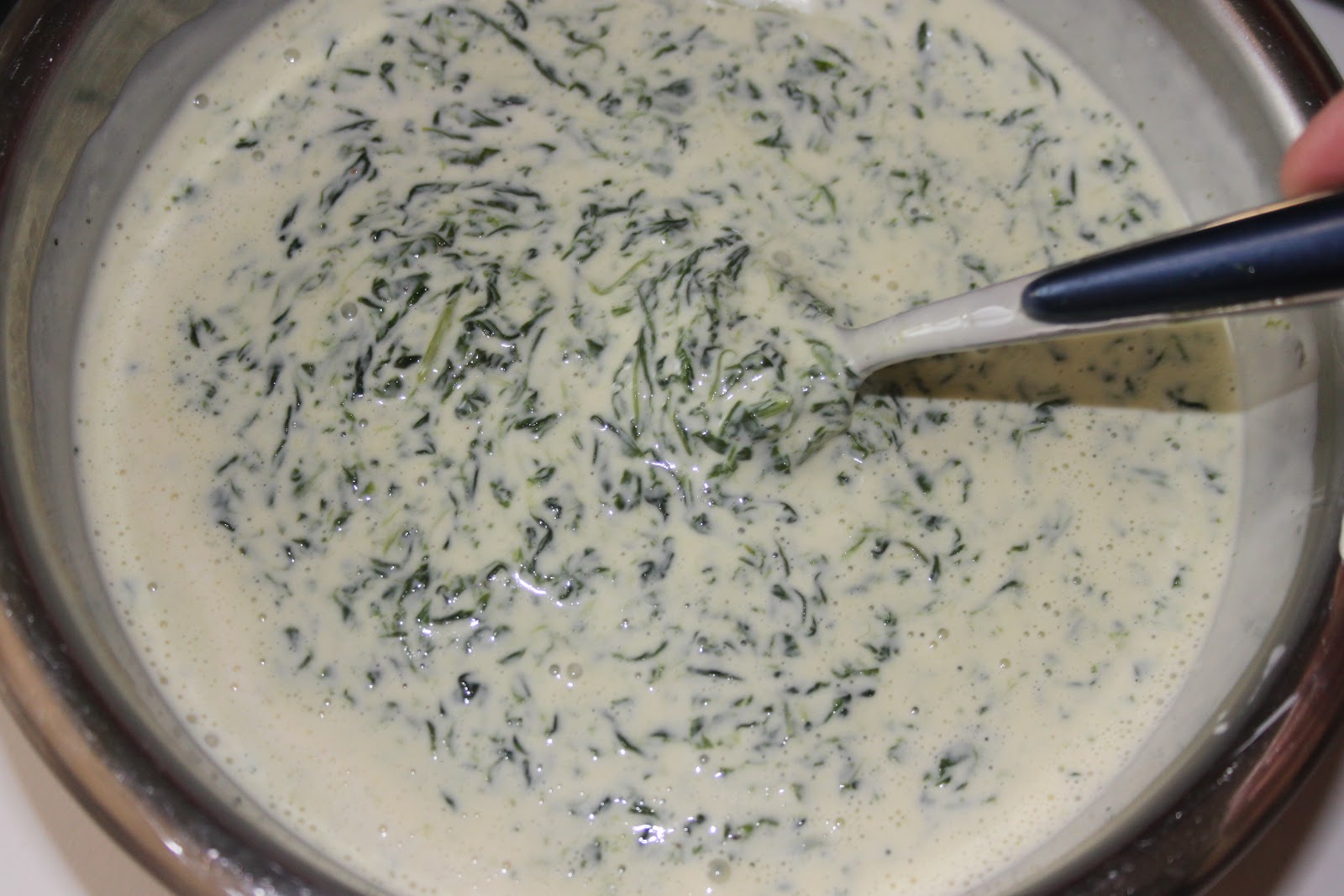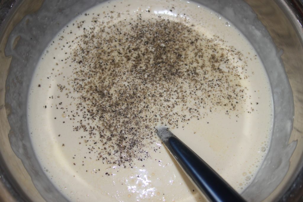 - Pendant ce temps, préparer la migaine: mélanger les oeufs et la crème (sur la photo il y a 5 oeufs, mais pour 400g de crème, il faudra bien 4 oeufs!).