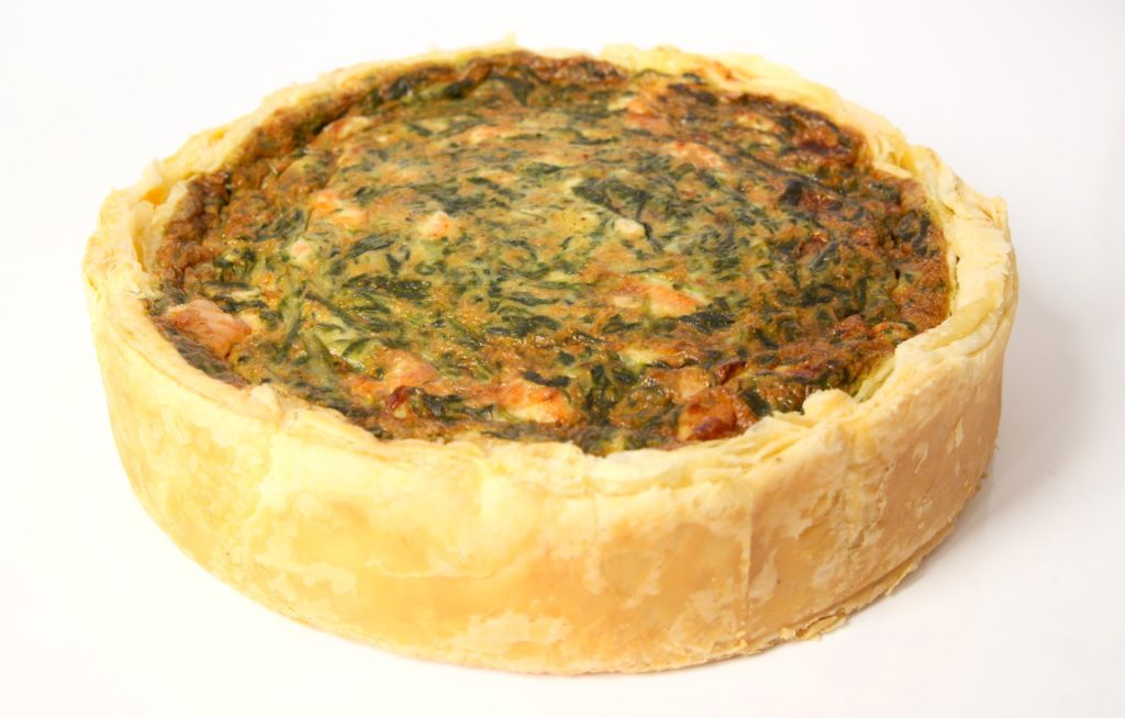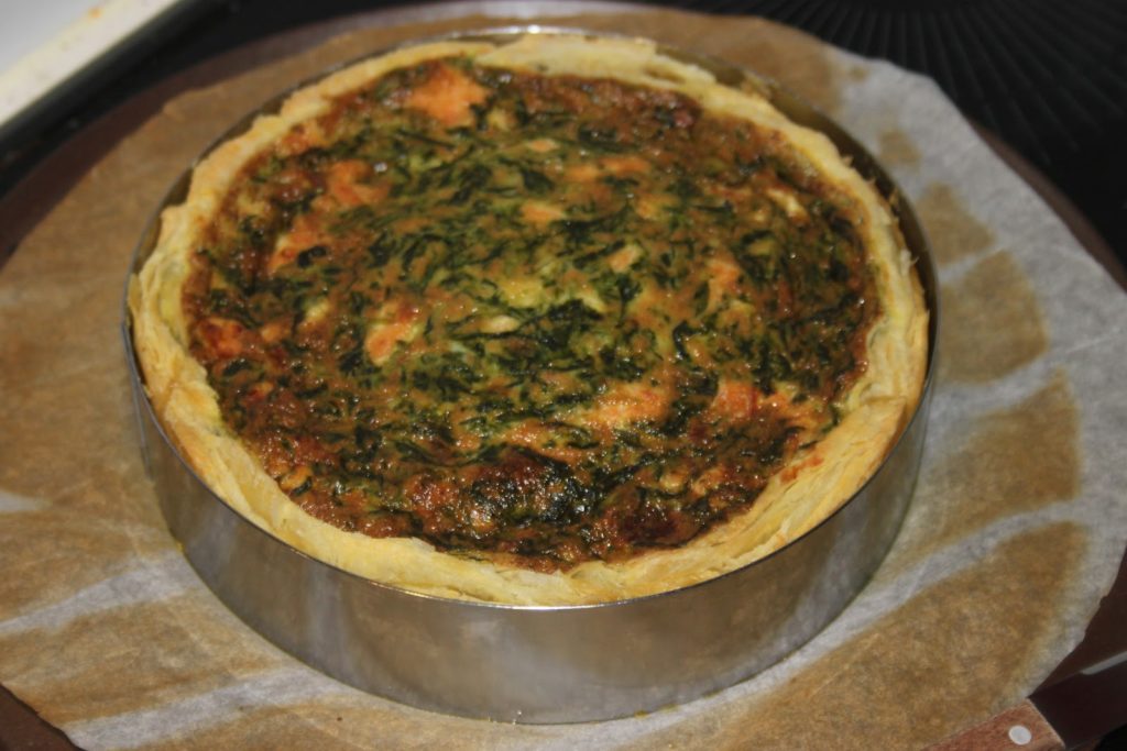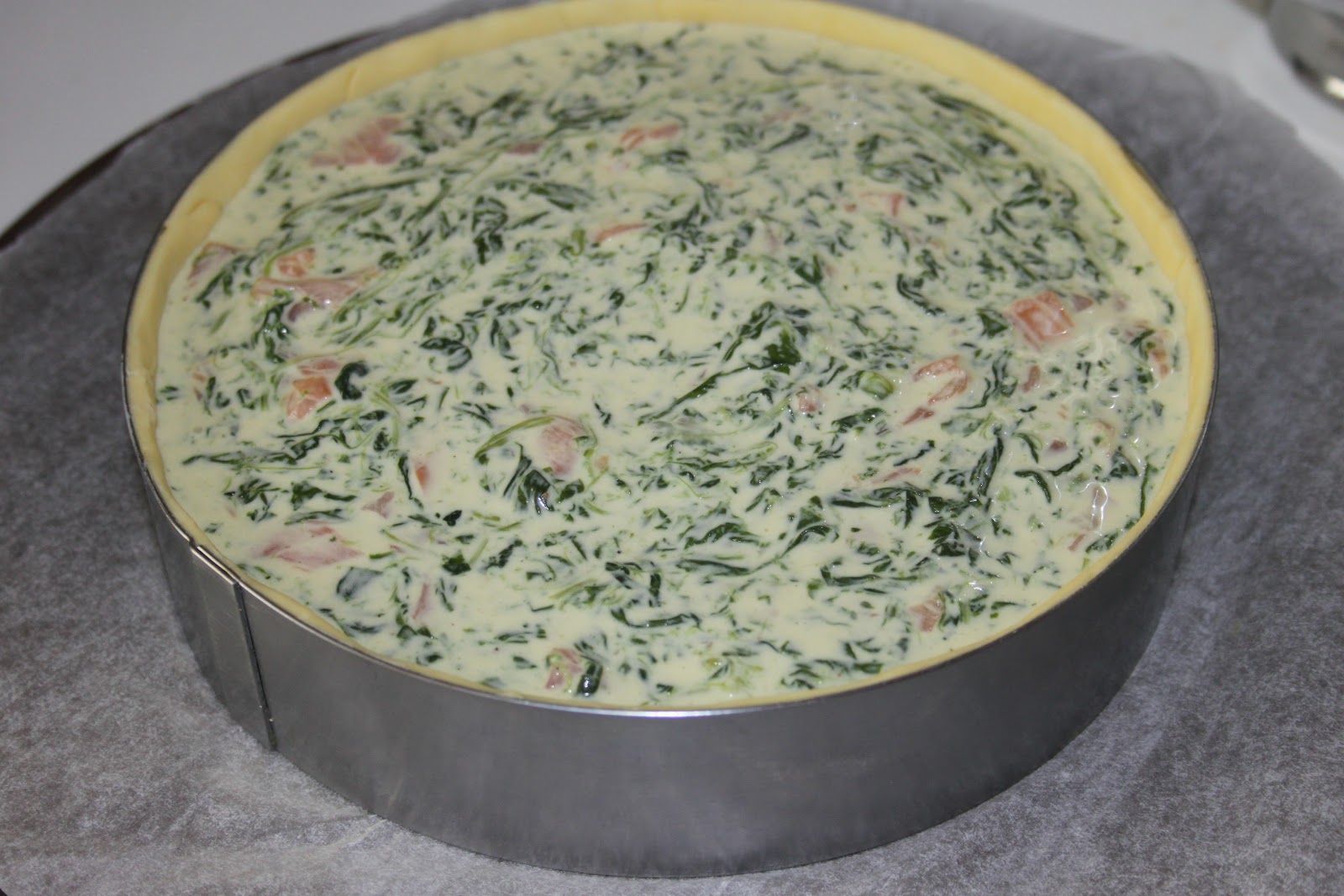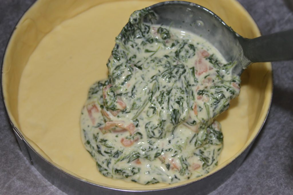 - Foncer (garnir de pâte) un cercle à mousse (pour une quiche épaisse) de 20cm de diamètre et 4,5cm de hauteur. On peut changer de cercle ou encore la faire dans un moule classique!