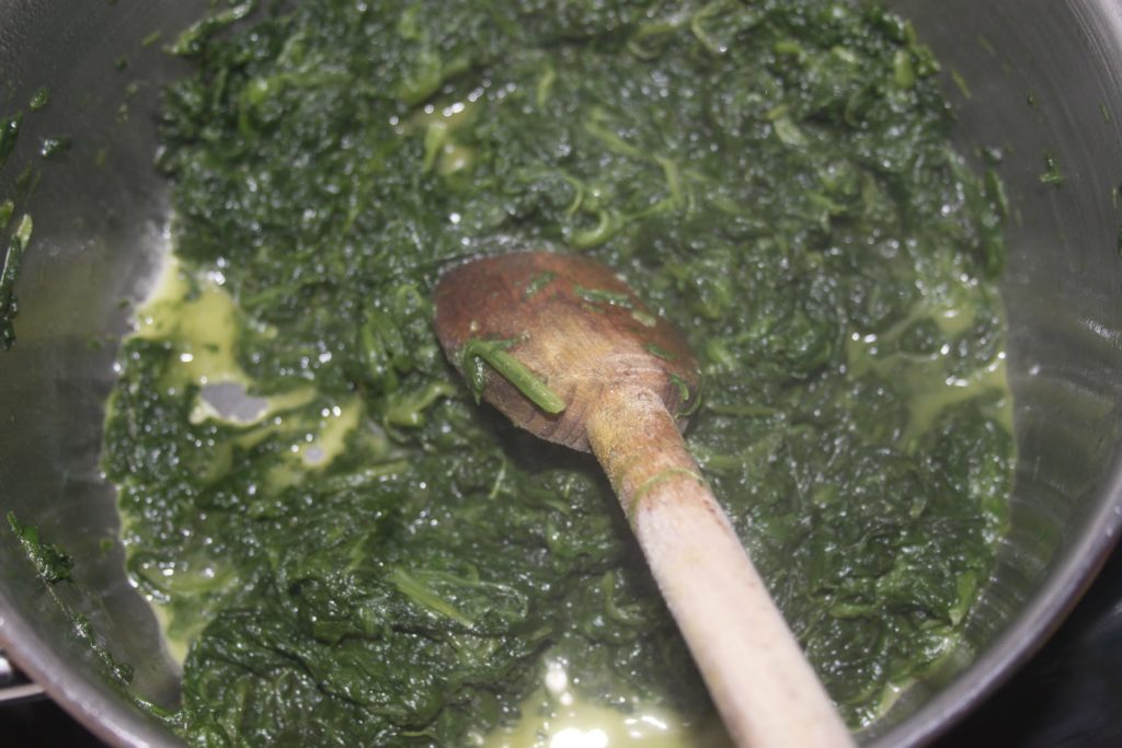 Mettre l’huile d’olive et le beurre dans une casserole et y faire cuire les épinards. Les épinards seront assez cuits quand ils ne rendront presque plus d’eau.