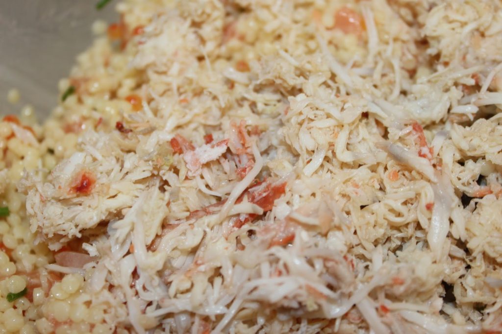 - Ajoutez la chair de crabe. Prenez un crabe de bonne qualité. Je préfère encore un bon surimi qu’un crabe de mauvaise qualité très floconneux. Ici j’ai pris du nautilus « pinces et chair » sans cartilage.