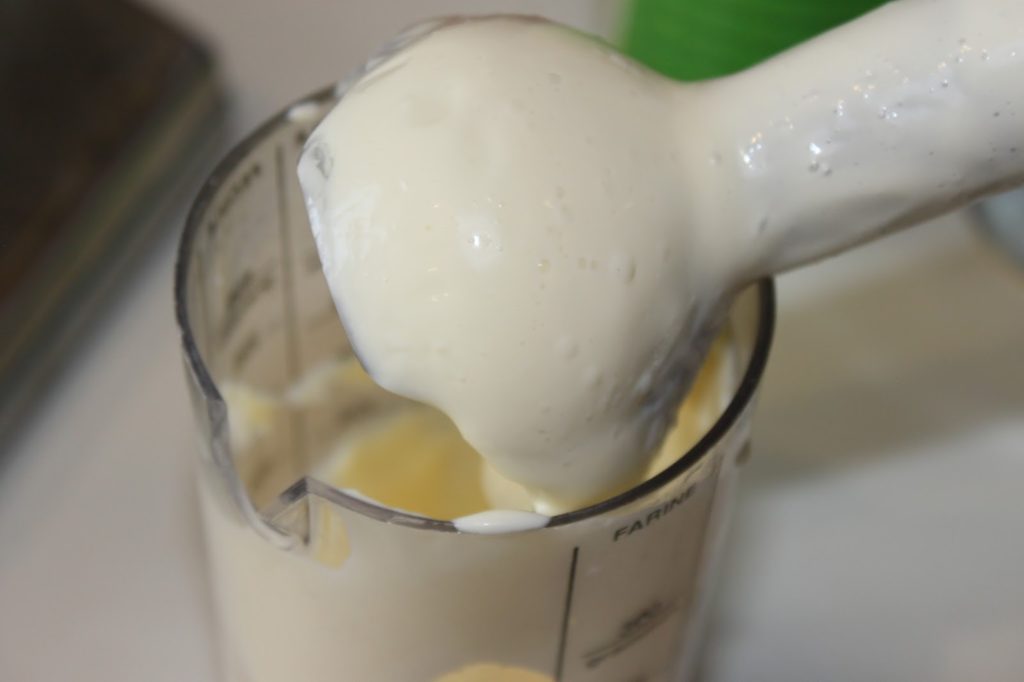 - Pour la sauce, c’est vraiment simple. Mettez l’œuf, l’huile, le jus de citron, du sel et du poivre dans un récipient étroit. Avec un mixeur plongeant, (type bamix) la sauce va se faire en quelques secondes. Commencez à mixer dans le fond puis remontez pour que la sauce s’émulsionne parfaitement.
