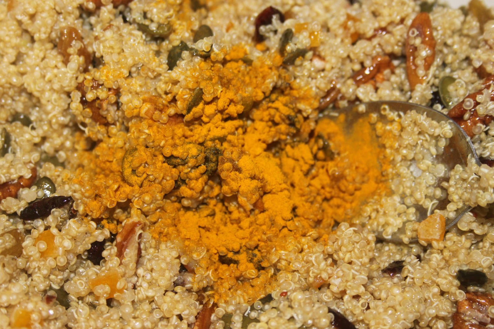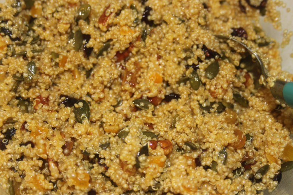 -300g de quinoa -80g de noix de pécan -70g de graines de courges -60g d’oranges confites coupées en dés -70g de canneberges séchées -30g de raisins secs -30g d’amandes effilées -1 petit bouquet de coriandre -1/2 cuillerée à café de curcuma -1/4 de cuillerée à café d’ail en poudre (pas semoule) -sel, poivre -2 cuillerées à soupe de miel -3 cuillerées à soupe d’huile d’olive -5 cuillerées à soupe de jus d’orange