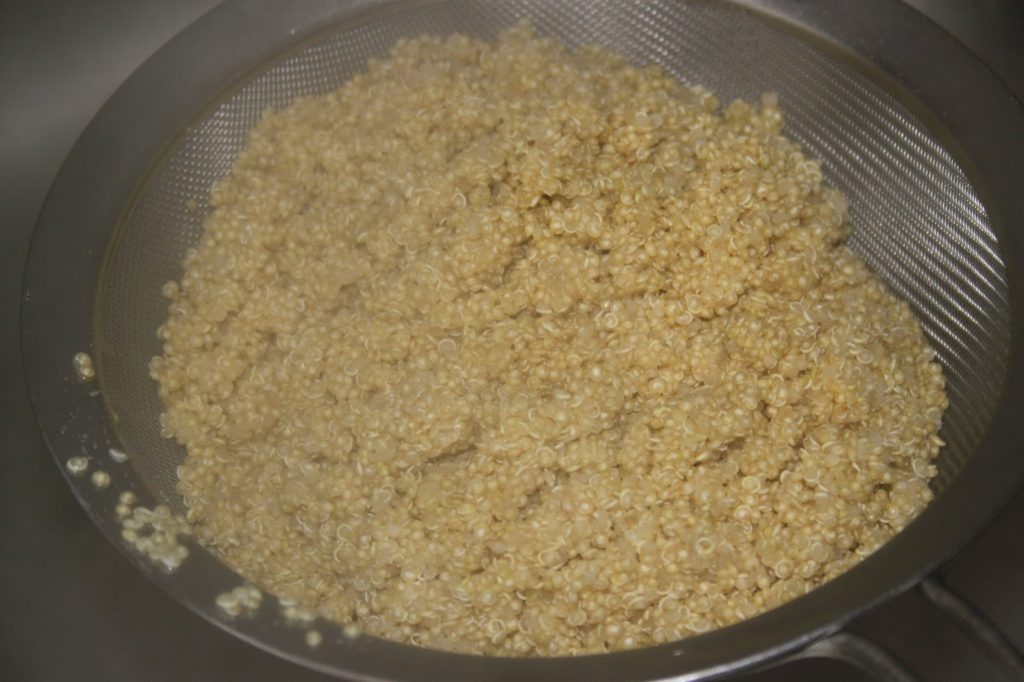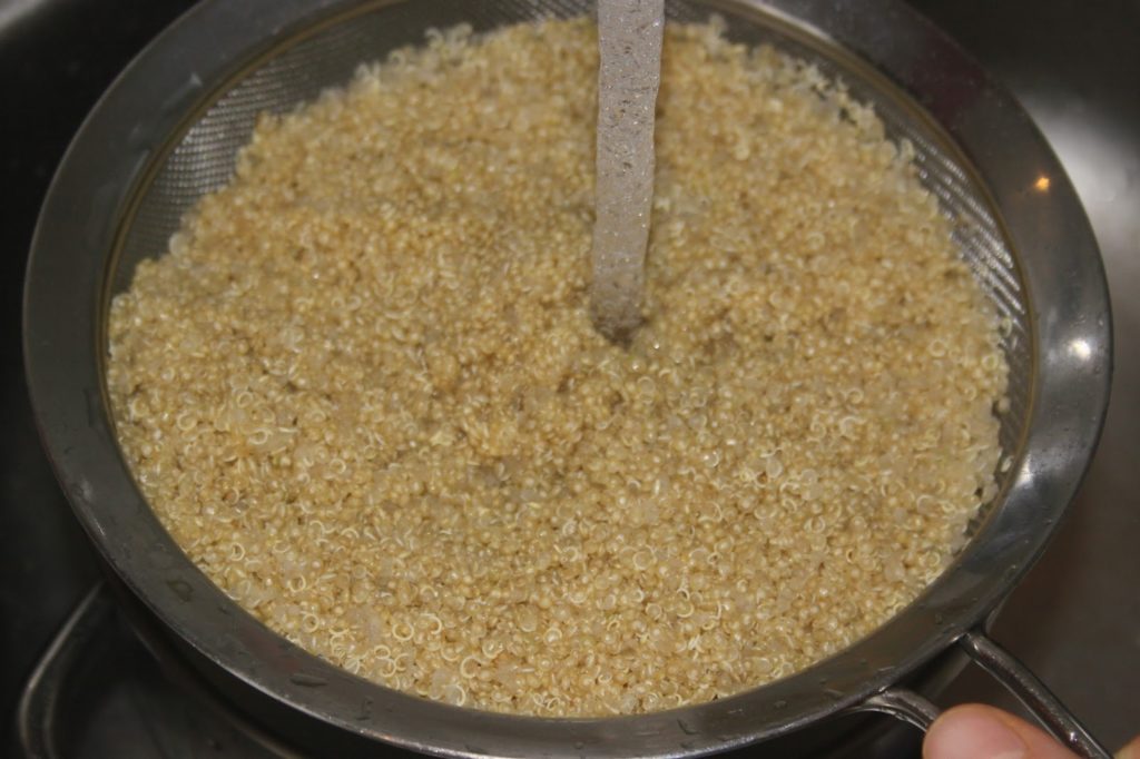 Égoutter (dans un tamis fin car la passoire laisserait passer les grains de quinoa).