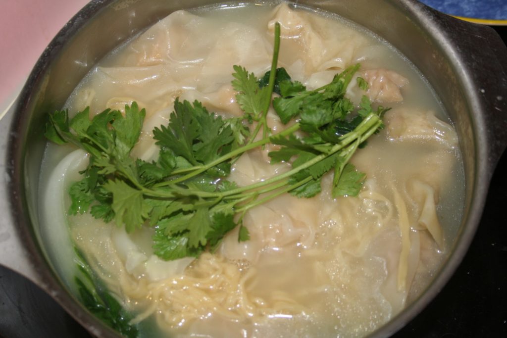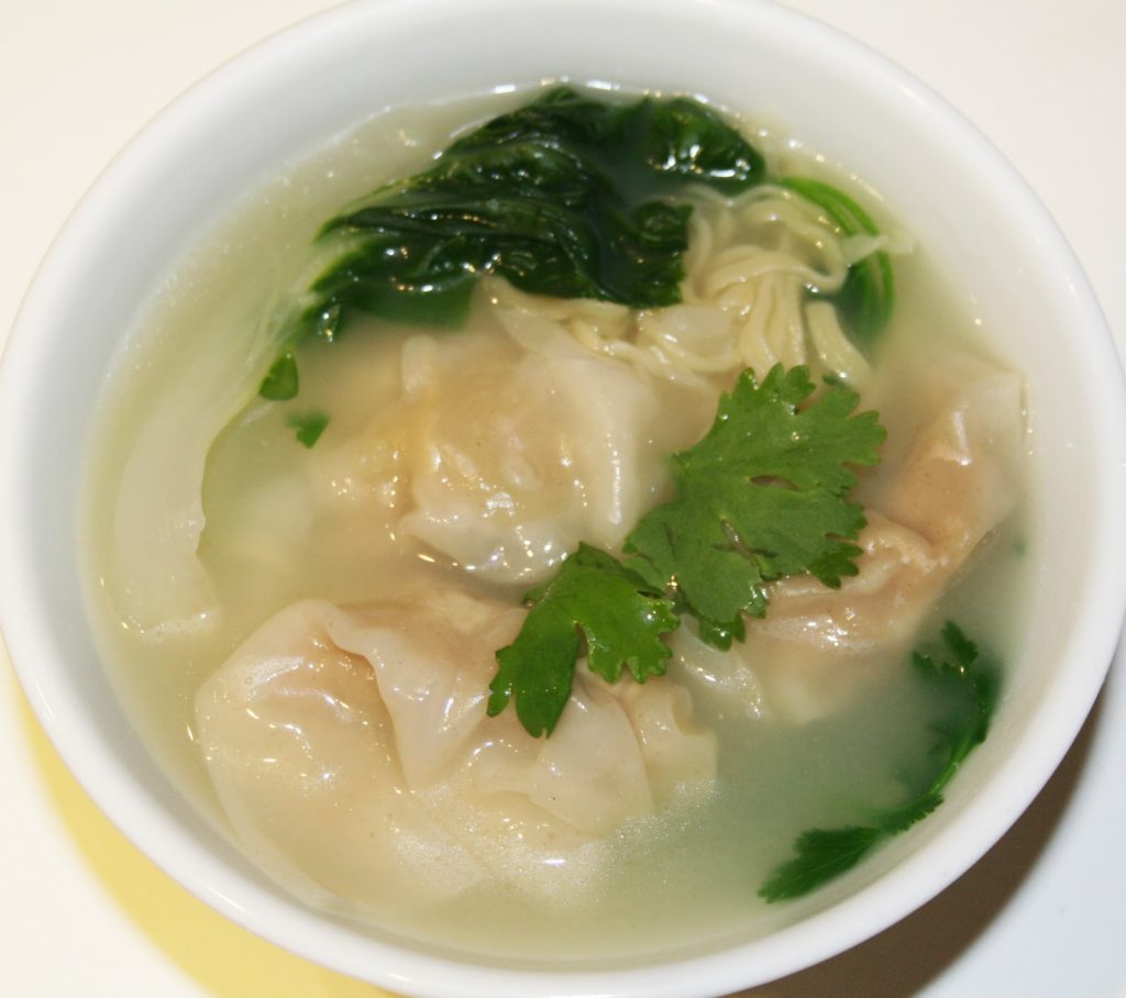 La soupe de nouilles aux raviolis « won ton » est un grand classique de la cuisine chinoise. J’ai cherché à la réaliser sans ajouter de cube spécial bouillon won ton et je vous livre donc la recette réalisée entièrement « maison » mis à part la pâte à won ton. « Won ton » veut littéralement signifier « manger des nuages »… Les raviolis flottent en effet dans cette délicieuse soupe. J’ai également mis la recette des pâtes « maison » mais on peut toutefois se faciliter la tâche en achetant des pâtes chinoises toutes prêtes…!