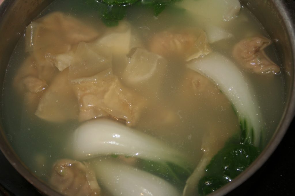 Dans le cas des pâtes maison: faire cuire les pâtes dans une casserole à part et égoutter les nouilles. Sinon ajouter les pâtes avec les raviolis dans le cas de pâtes toutes prêtes…Remettre le bouillon dans une casserole, ajouter un nouveau bokchoï. Porter à ébullition. Ajouter les raviolis.