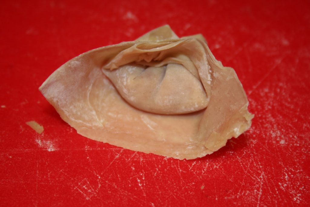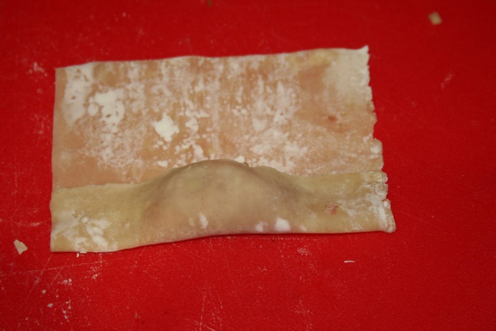 Puis refermer en rabattant les côtés vers le centre et sceller avec un point d’eau. Sur la photo le ravioli a été tourné vers l’appareil photo…. Faire la même chose avec le reste de farce.