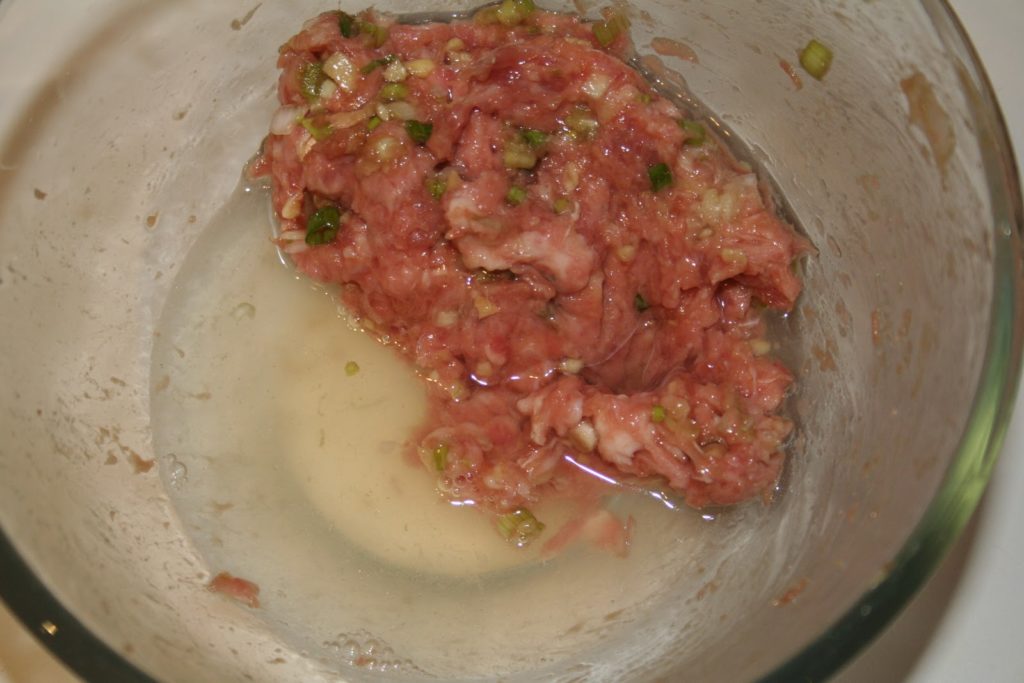 Préparer la farce à raviolis en mettant tous les ingrédients (sauf le bouillon) dans un bol… Bien mélanger pour tout agglomérer. (Sur les photos je n’ai pas mis de crevettes, mais c’est à ce moment qu’il faut les mettre!!).