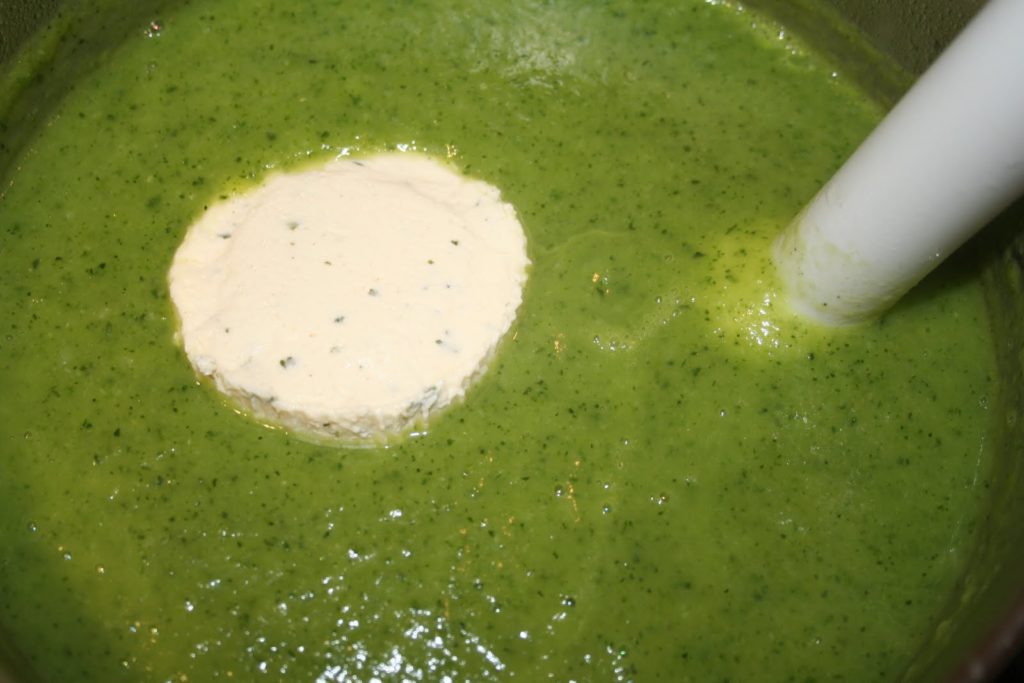 - Ajouter les 100g de boursin. J’ai mis un entier (150g) mais je pense que cela pourrait déplaire à certains. Il faut savoir que le boursin va sentir dans la soupe chaude. Mais une fois refroidie, plus aucune odeur n’arrivera à nos narines(!) mais le goût sera bien présent et délicieux!