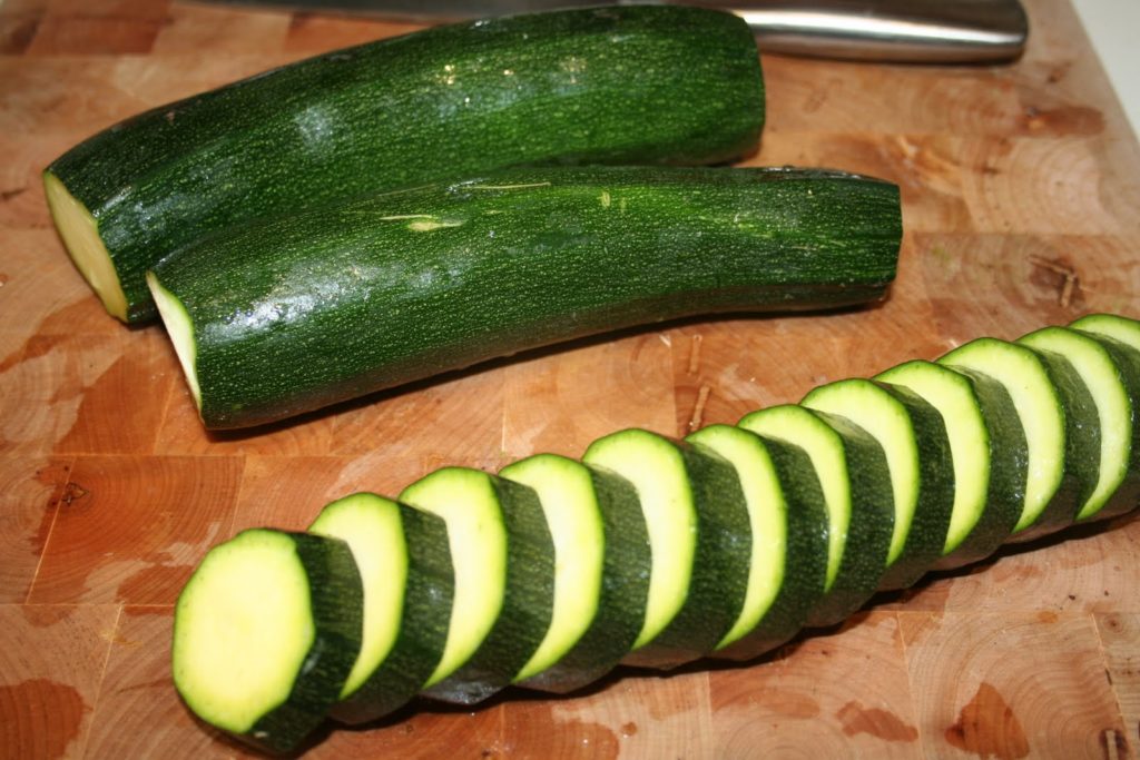 - Laver et couper les extrémités des courgettes. Les couper en tranches de 1,5cm. Il faut en effet qu’elles gardent une bonne épaisseur pour ne pas trop les cuire.