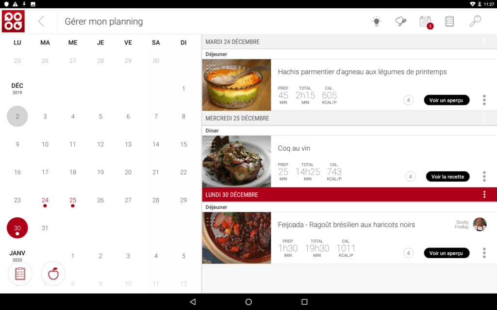 Planning : un petit outil pratique, car vous pouvez prévoir à l’avance vos repas et les mettre dans le planning. Il est assez intuitif (un peu comme toutes les fonctionnalités !) et vous permet par exemple de ne plus avoir à vous demander quoi manger pour des semaines chargées, ou au contraire, comme je le faisais déjà avant pour moi, une semaine de vacances entre amis avec tout ce que nous aimons !