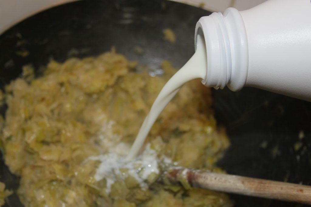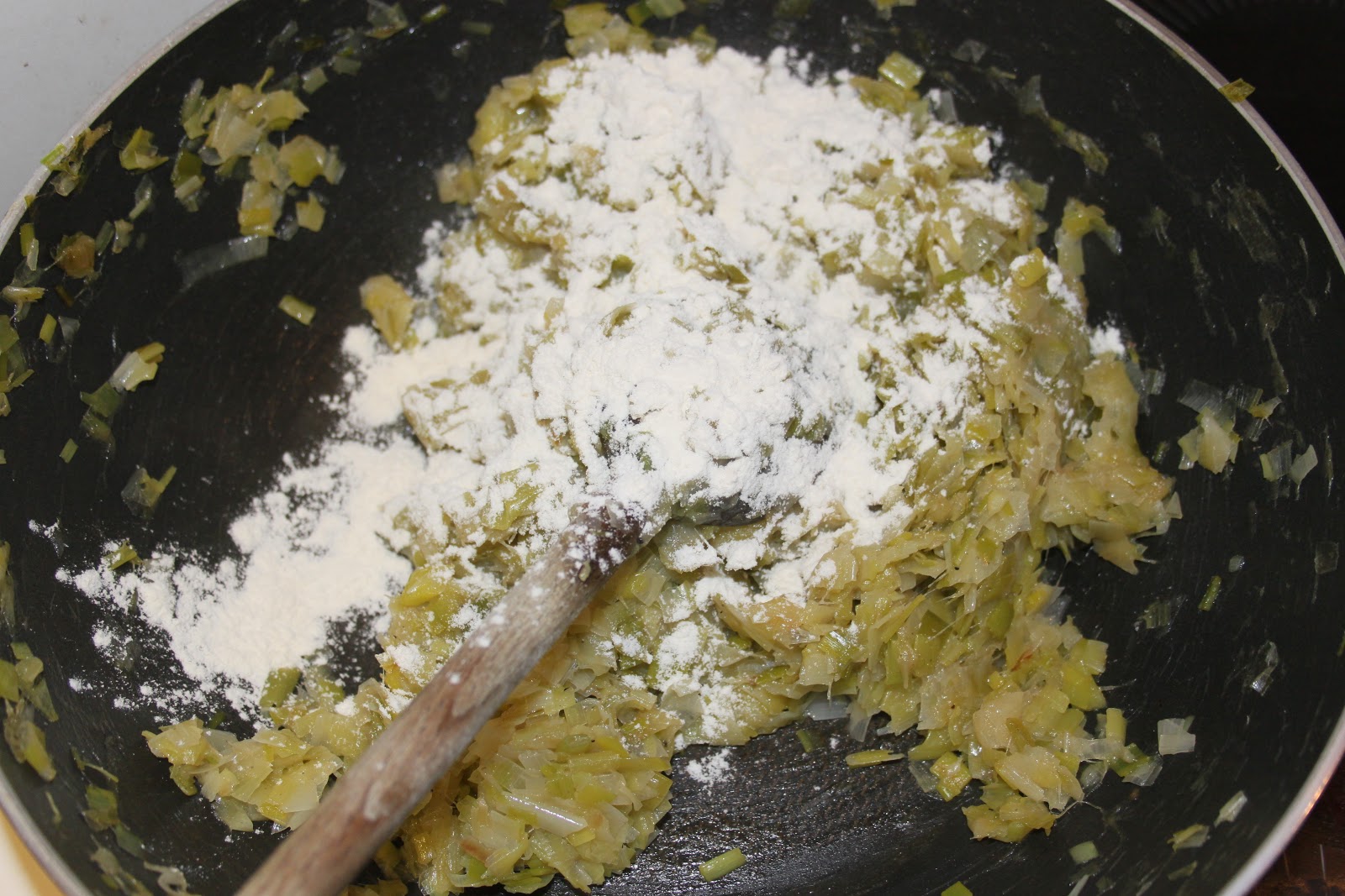 - Ajouter la farine en pluie sur les poireaux et bien mélanger.