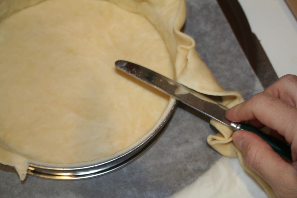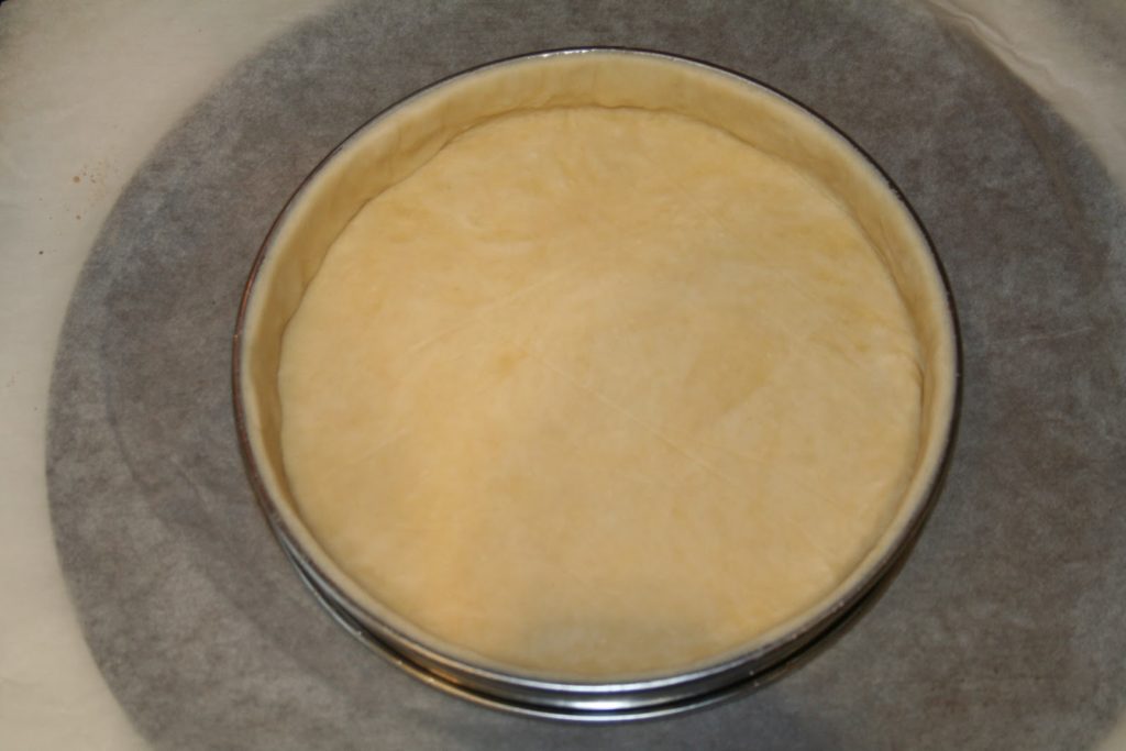 Foncer (garnir de pâte) le moule ou le cercle de 22cm. J’utilise des cercles pour les tartes, car la pâte brisée est parfaitement étanche.