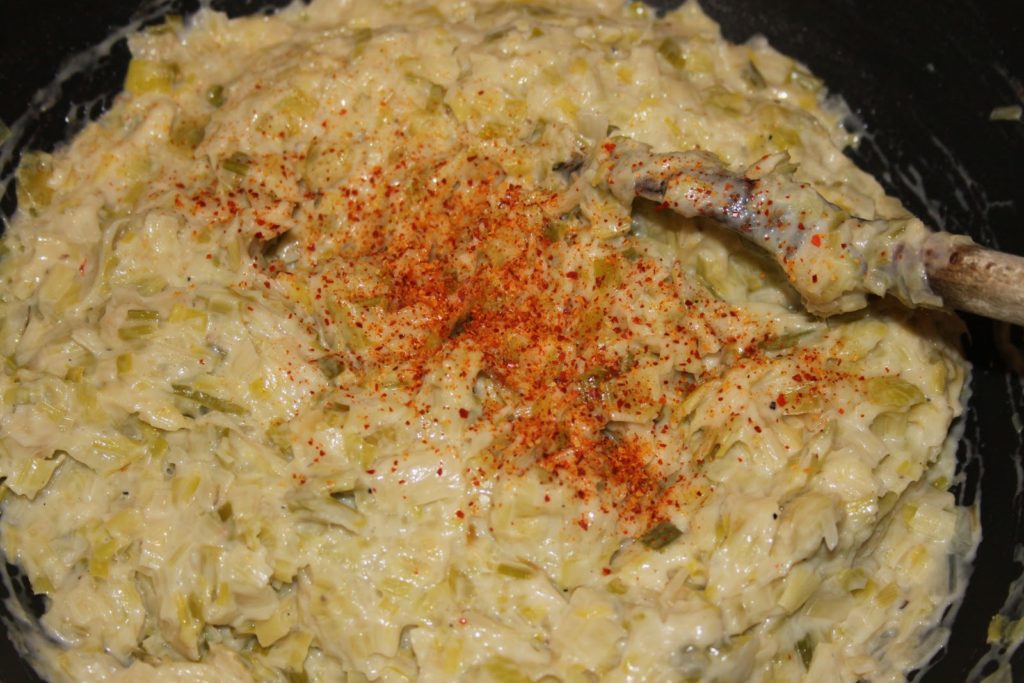 Ajouter la farine en pluie sur les poireaux et bien mélanger.