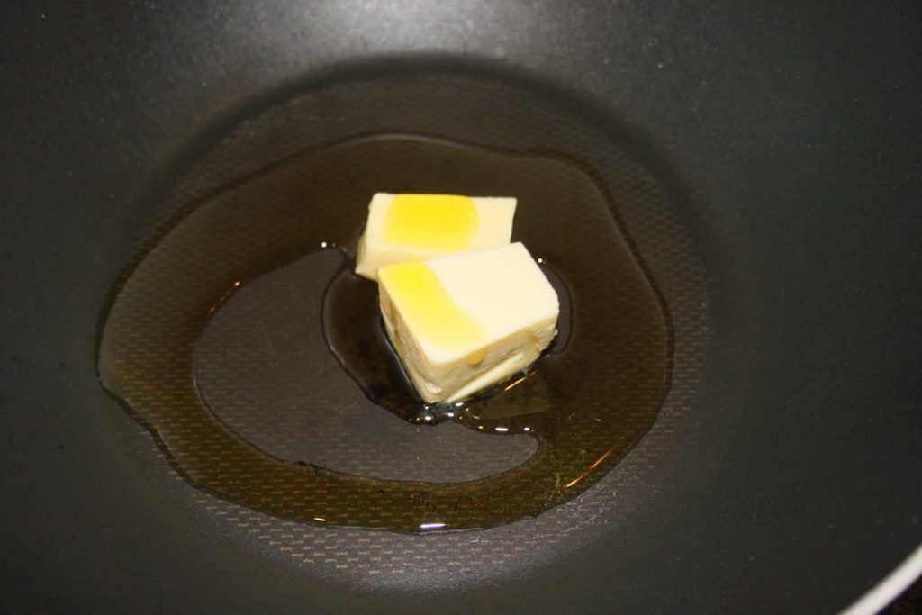 - Mettre le beurre et l’huile d’olive dans une large poêle sur feu modéré.