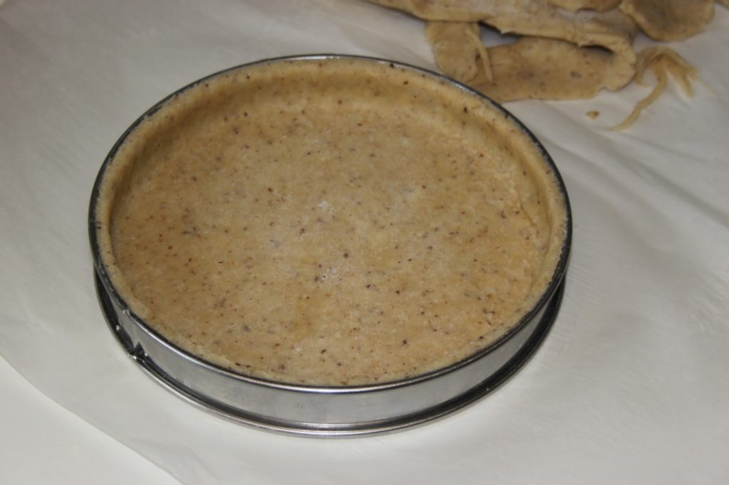 - Foncer le cercle en s’assurant d’avoir bien l’angle droit à l’intérieur, puis en coupant l’excédent de pâte. Pour la technique voir ICI (la tarte bourdaloue) ou LÀ (la quiche lorraine).