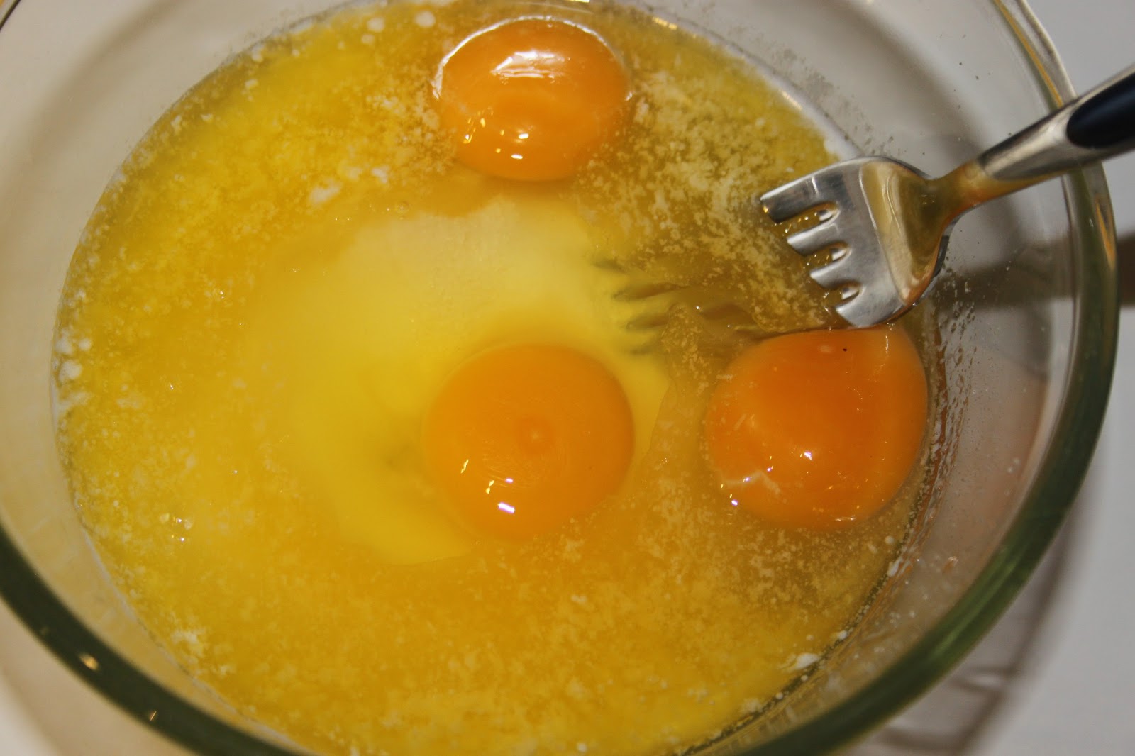 - Mélanger les œufs, le beurre fondu et le sucre.