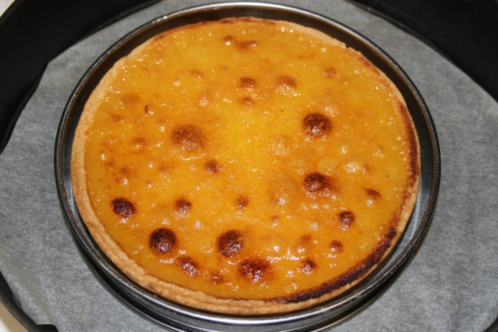 Ajouter le zeste des trois citrons et leur jus.Étaler la pâte (peu importe la pâte choisie) sur un plan de travail légèrement fariné ou un papier sulfurisé.Foncé un cercle de 26cm ou deux de 18 ou 19, posés sur un papier sulfurisé.Piquer le fond de pâte.Cuire la pâte à blanc avec la méthode que l’on préfère. Ici, la méthode du sac de farine… Voir les recettes de tartelettes pour les explications.Cuire à 180°C pendant 10 minutes puis enlever le sac. Cuire de nouveau 10 minutes en repiquant bien le fond de pâte.Ajouter la crème de citron et enfourner pendant 30 à 40 minutes.La crème doit être en ébullition et commencer à dorer en surface, un peu comme une crème brûlée.Laisser refroidir sur une grille.Déguster tiède ou alors le lendemain ! Ce sera encore meilleur ! Merci Jean-François!