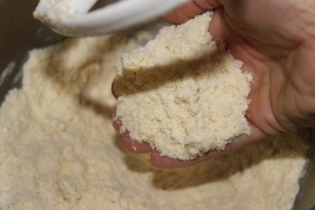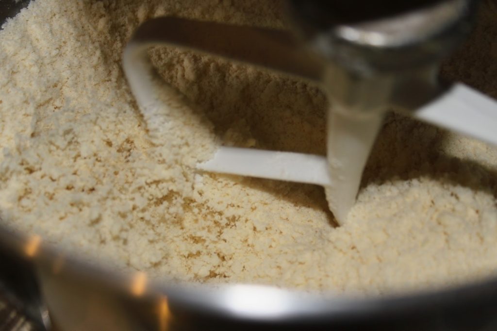 - Mélanger à la main ou avec la feuille du robot (le k) jusqu’à obtenir une sorte de pâte sableuse.