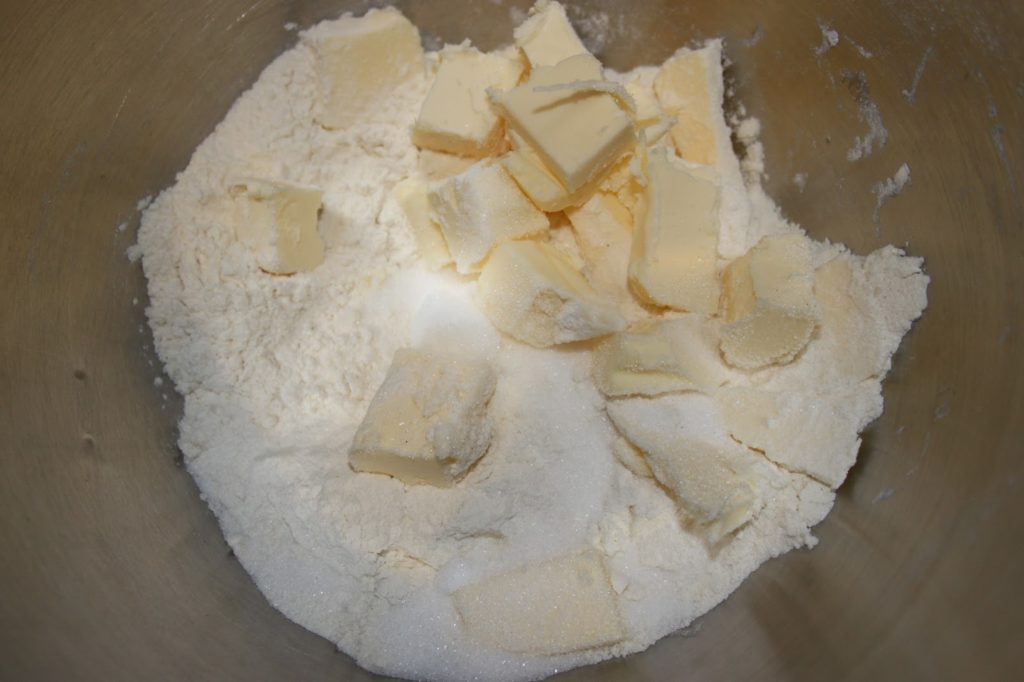 - Pour la pâte brisée sucrée. Mettre le sucre, la farine et le beurre froid coupée en morceaux dans le bol d’un robot ou dans un récipient.