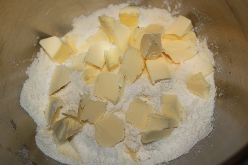 - Mettez la farine, le sucre et le beurre froid coupé en morceaux dans un récipient ou la cuve d’un robot.
