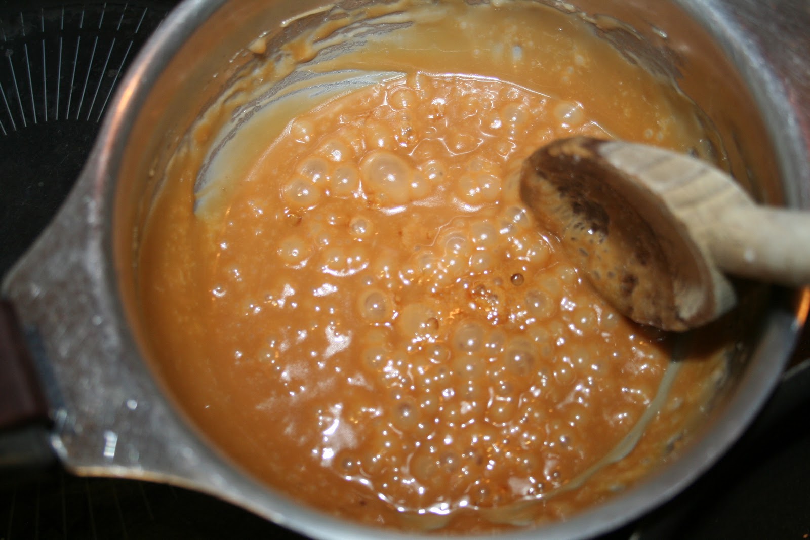 - On peut tout à fait mélanger avec une cuiller en bois sans avoir besoin de passer un coup de pinceau trempé dans l'eau, car ce caramel va aller sous les pommes... Il ne risque donc pas de cristalliser.