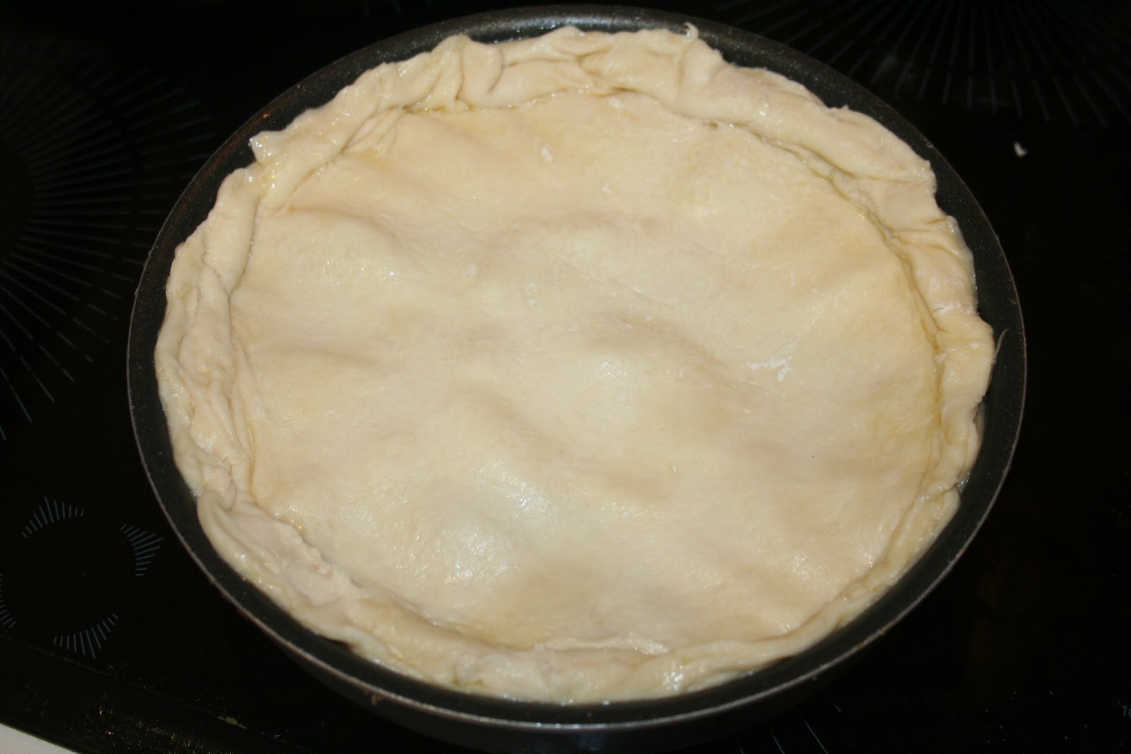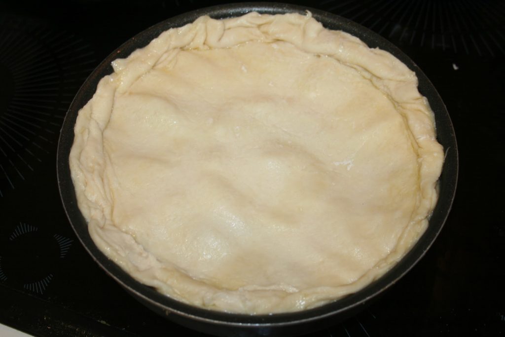 - Sortir le plat du four et placer le cercle de pâte sur le dessus. Rabattre la pâte sur le bord intérieur du moule.