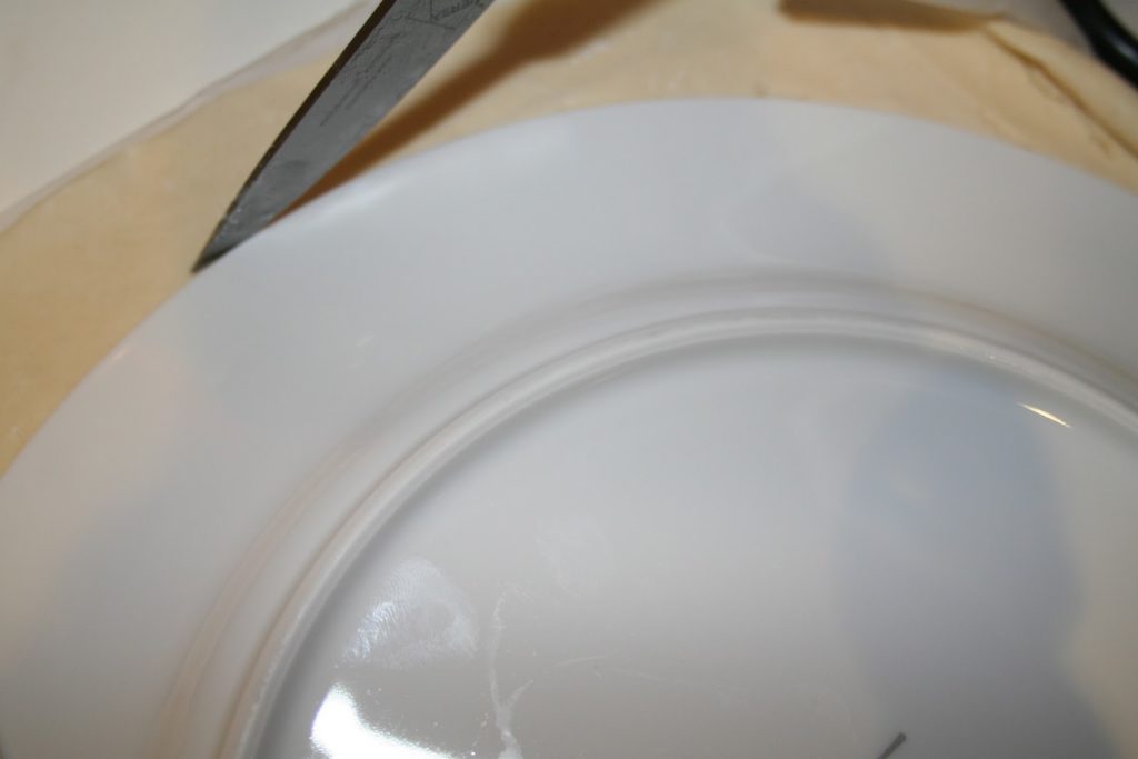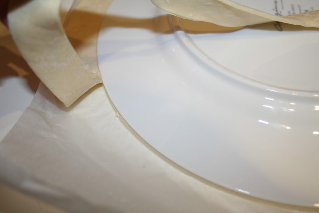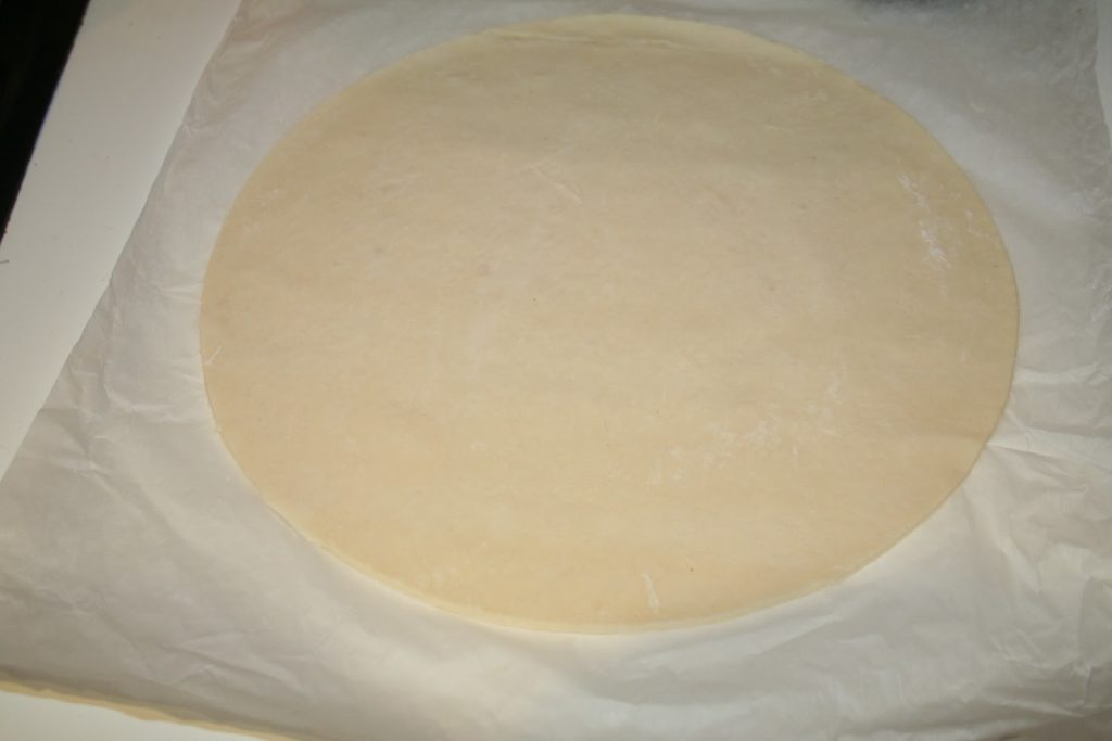 - Pendant ce temps, étaler finement la pâte feuilletée au rouleau sur une feuille de papier sulfurisé. Avec une assiette, couper un cercle au couteau.