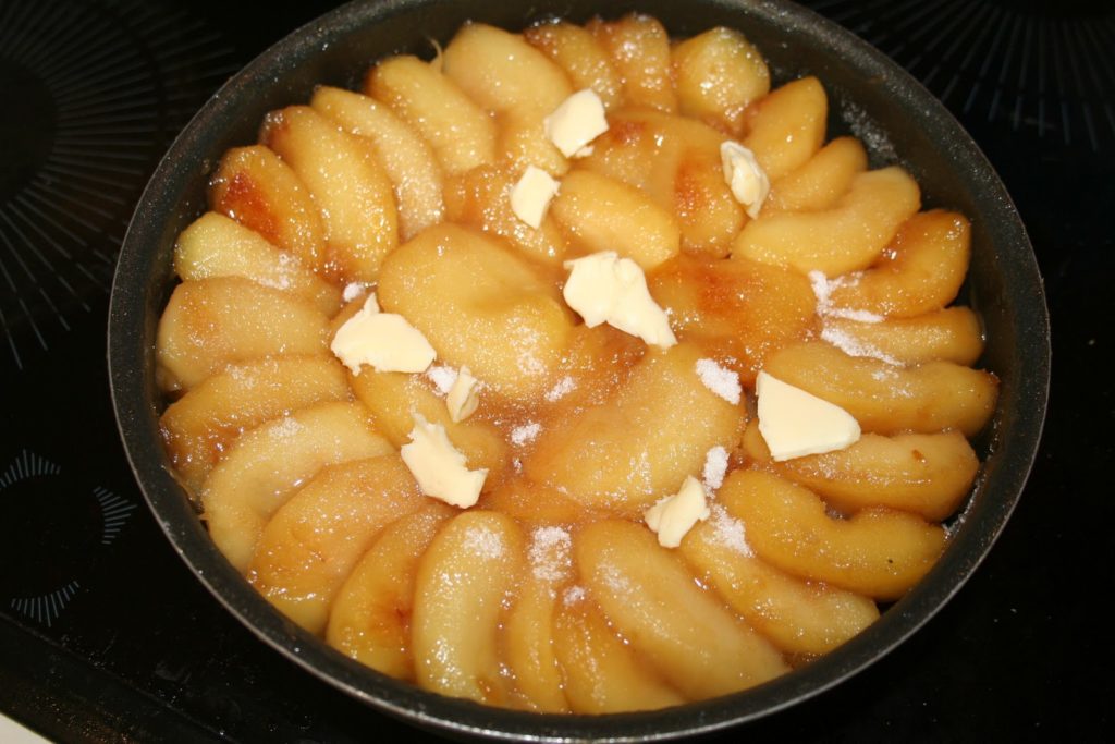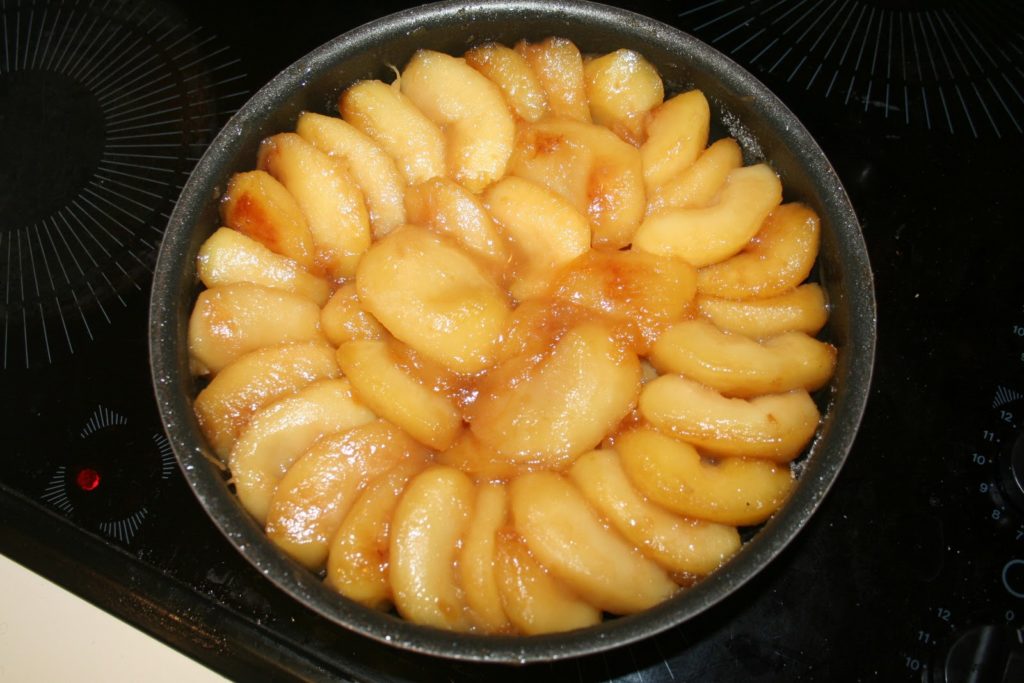 Je propose ici une version où l’on cuit les pommes avant de les placer et de les ranger dans le moule. C’est pour moi le seul moyen de les ramollir et de pouvoir en mettre plus. C’est surtout qu’en cuisant les pommes dans une poêle à part, les pommes ne rendront presque plus de jus à la cuisson au four.